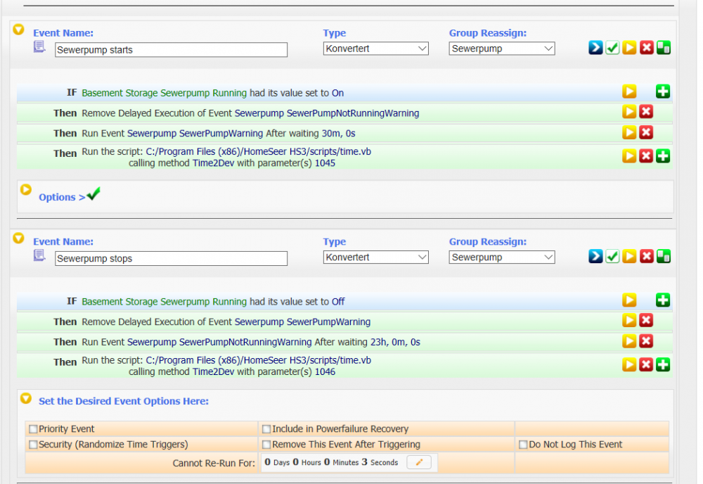 15. Nei HS styrer IKKE pumpa, den overvåker den og gir beskjed dersom den ikke har gått på 2 døgn (noe som er helt ok dersom vi er på ferie) eller dersom den har gått i mer en 2 min. (Noe som ikke har skjedd siden jeg byttet til ultralyd styringen) HS Overvåker også Sikringene både til styrestrømmen og motor strømmen, og gir også beskjed dersom motorvernet slår ut (så slipper jeg å vente på meldingen om at den ikke har gått på to dager) Her er eventene på start og stopp: (Hm jeg ser det er 30min og 23h, ikke 2 dager og 2 min som jeg sa) Time2Dev er et script som legger dato og kl i et device for å kunnen vise enkelt på HST
