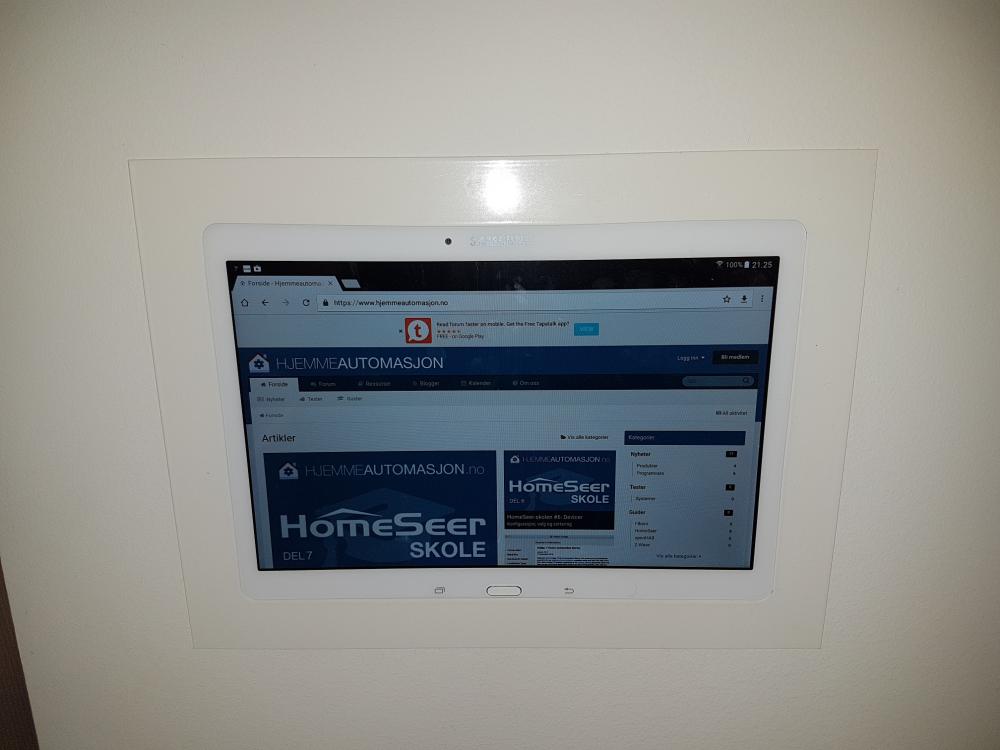 Om du skal felle inn i veggen, så må du ha en ramme rundt ellers blir det stygt. Jeg har felt inn tablet i veggen og fikk laget en ramme rundt, og den har blitt helt "flush" med veggen. Er festa med borrelåsbånd. Her er det en dude som har felt inn en ipad i et kjøkkenskap -> https://www.ikeahackers.net/2012/06/ipad-flush-mounted-in-kitchen-cabinet.html