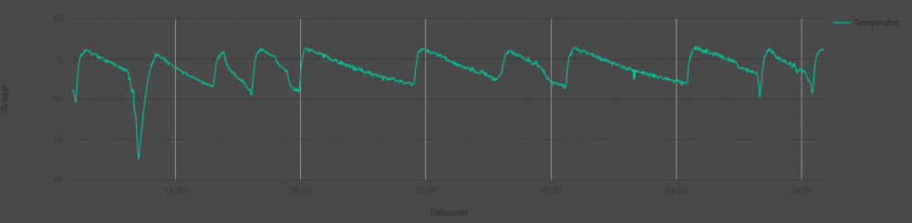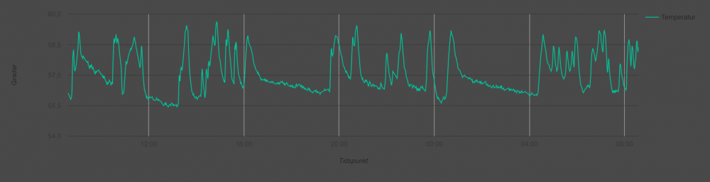 Har du ekspansjonstank, kanskje det kan være at vannet i den "bytter" plass med vannet i utløpet av tanken. Når vannet i den blir kaldere enn vannet i utløpet og dermed synker og du får den lille duppen. Hos meg ligger utløpets temperatur rundt 57 hele tiden og temperaturen nede ved termostaten er her, ingen dupp når den varmeelement går på. Her er hvordan jeg har satt opp målingene av vvb -