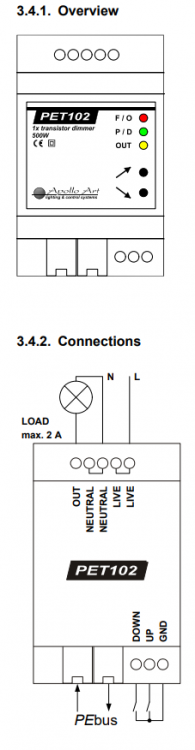 PET102 Den kan styres både med RS485 (PEbus), trykk-knapper på selve dimmeren, eller bruke "in"-inngangene på den. Brukte disse før jeg fikk DALI-styring, mener å huske at disse dimmet pent.