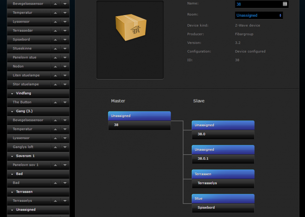 12. Vedlagt: Oppsett for 38.0 (switch-enheten), de to lampene og association. 9 er switchen, 17 og 18 er en Fibaro Dimmer 2 (som fungerer helt fint). Eksempelet viser en dimmergruppe (opp/ned) på Nodon-bryteren, men markering av én switch-enhet gjør at begge markeres uansett hvilken gruppe som er valgt.
