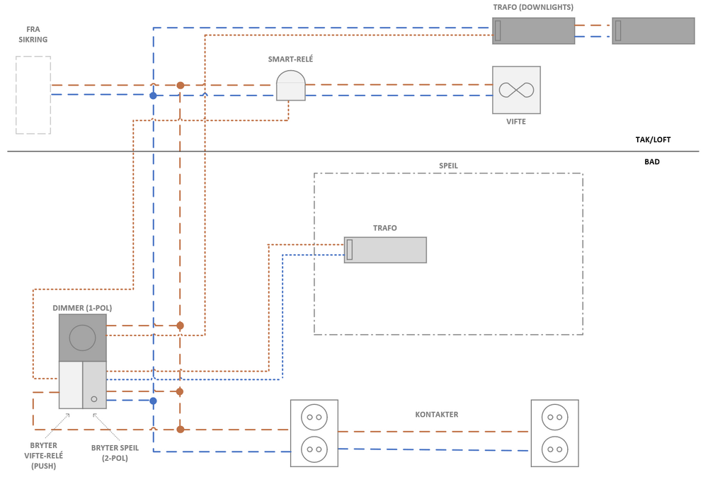 9. Trenger en liten sanity-check av koblingsskjema før jeg legger rør og gir dette videre til elektriker (striplede linjer har felles koblingspunkt mens prikkede er det som kommer fra en bryter). I forbindelse med oppussing av bad skal det inn noen downlights, nytt speil med integrert LED lys og noen nye stikk. Har ikke helt oversikt over reglene rundt 1- vs 2-pol på badet, men utafra det jeg har lest og forhørt meg om skjønner jeg det slik at det bare er speilet som trenger 2-pol bryter. Jeg trodde kanskje downlights-dimmer også måtte være 2-pol, men en elektriker bekjent sa det ikke var noe krav ettersom det er LED lys som går gjennom trafo. Kanskje noen kan bekrefte? Speilet har av/på bryter integrert, men skjønte det kunne være lurt med en bryter også utenfor dør og at den da måtte være 2-pol. Viften (i tak) skal kobles fra et smart rele som vil ligge i en koblingsboks på loftet. Den har en inngang som kan kobles til en bryter for lokal styring.