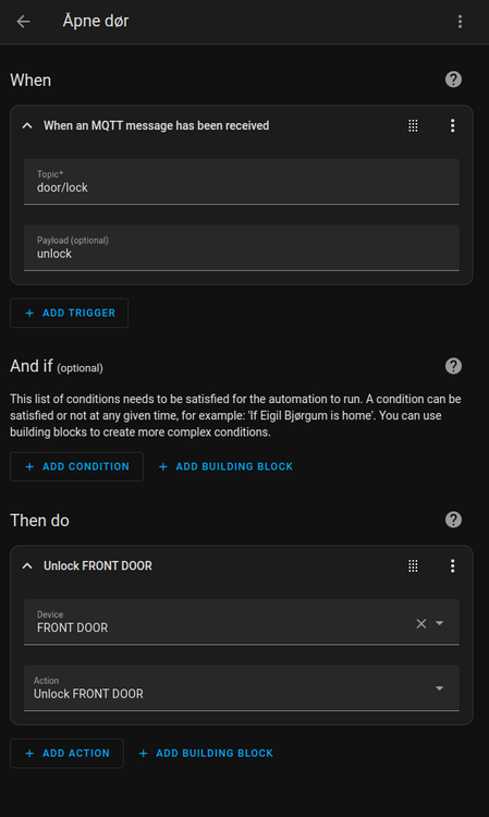 Opprette kobling mellom Yale Home og MQTT i HomeAssistant.iotux svarte på SveinHa sitt emne i Automasjoner Her er et eksempel på "Åpne dør" med MQTT-melding, laget via web-grensesnittet: I "automations.yaml" ser det slik ut: alias: Åpne dør description: "" triggers: - trigger: mqtt topic: door/lock payload: unlock conditions: [] actions: - device_id: d3d3776b68abb6b5ec328c405d0c5170 domain: lock entity_id: 9e344ce79a0aacc6ba3eaa40c1916642 type: unlock mode: single Her er et eksempel på hvordan du kan lese ut flere verdier som restultat av 1 MQTT-melding: alias: Yale status description: Dør batterinivå triggers: - topic: door/lock payload: status trigger: mqtt conditions: [] actions: - action: mqtt.publish data: topic: door/lock/battery payload: "{{ states('sensor.front_door_battery') }}" - action: mqtt.publish data: topic: door/lock/status payload: "{{ states('lock.front_door') }}" mode: single Du kan sjekke ved å åpne to vinduer og kjøre disse, en i hvert vindu: ~$ mosquitto_sub -v door/lock -m status ~$ mosquitto_sub -v -t door/lock/#