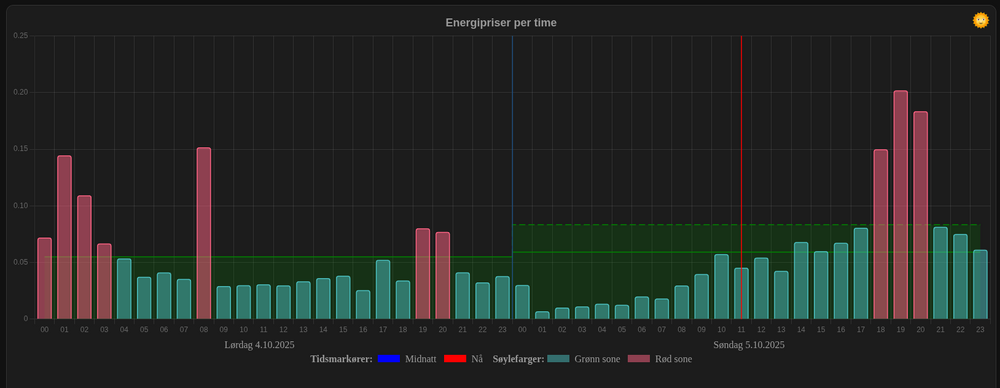 Smarthussystem for styring av termostat etter pris på strømiotux svarte på Arne_b sitt spørsmål i Nybegynner ElWiz har fått en oppdatering med graf som viser priser. Grafen oppdateres når morgendagens priser er tilgjengelig. Som regel skjer dette ca kl 13 hver dag. Grafen baserer seg på priser fra enten Nord Pool eller Entso-E. Lokale priser bestemmes ved å angi aktuell sone. Grafen er delt i to soner, grønn sone når timeprisen er under gjennomsnitt for døgnet og rød sone når prisen er over gjennomsnitt. Soneterskelen kan heves eller senkes fra et tilpasset "kort" i Home Asssistant eller ved å sende MQTT-meldinger til programmet. Ved overgang til ny time, sendes en MQTT-melding som viser om prisen er under eller over terskelverdien. Denne meldingen kan slå enheter av eller på I Home Assistant. Programmer krever en Tibber pulse satt opp til å snakke med egen MQTT-broker. Det er verdt å merke seg at grafen ikke er avhengig av HACS. https://github.com/iotux/ElWiz/blob/master/docs/elwiz-chart.md Mer info her: https://github.com/iotux/ElWiz#elwiz---a-program-to-read-data-from-tibber-pulse
