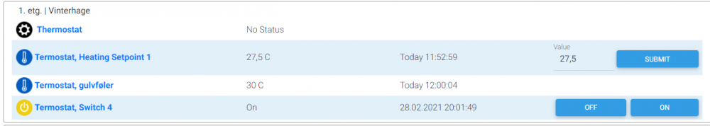 Takk, det gjorde susen! Nå svinger det igjen!! Ja, har dessverre ikke noen gode løsninger på vannbåren varme. Termostatens status er assosiert med on/off ventil på Z-wave. Eneste "plan B" jeg kan komme på er å måtte trekke signalkabel, og det har jeg ikke trekkerør for. Tar gjerne imot tips. -