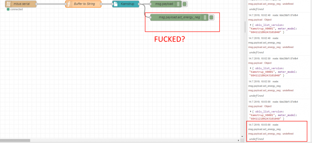 2. Hei alle sammen, elsker node-red og alt det vi holder på med her inne, men e akkurat startet. Sitter nå med node-red og node-red-contrib-ams-decoder. Problemer Sliter med at det ikke kommer noe fornuftig ut at av: msg.payload.obis_list_version msg.payload.meter_ID msg.payload.meter_model msg.payload.act_pow_pos msg.payload.act_pow_neg msg.payload.react_pow_pos msg.payload.react_pow_neg msg.payload.curr_L1 msg.payload.curr_L2 msg.payload.curr_L3 msg.payload.volt_L1 msg.payload.volt_L2 msg.payload.volt_L3 msg.payload.date_time msg.payload.act_energy_pos msg.payload.act_energy_neg msg.payload.react_energy_pos msg.payload.react_energy_neg Det er bare de 3 første som kommer... Peiling på hva dette kan være pga ? Er det pga shitty aliekspress adapter? flowsSkyNet97 AMS dekoder.json