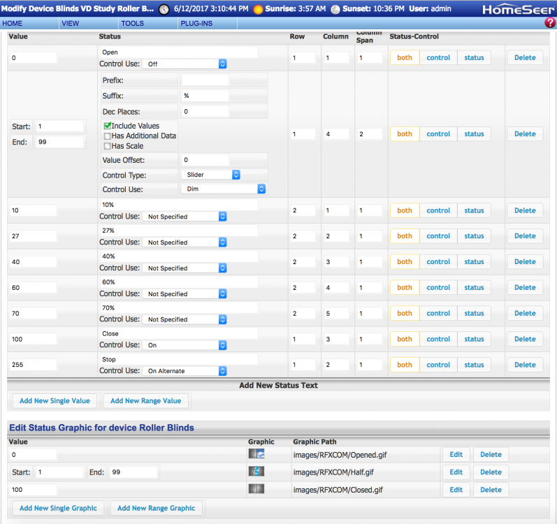 Dette er en guide for custom oppsett av RollerTrol RF rullegardinmotorer (m.nu selger vel den minste versjonen av disse) i HomeSeer 3. Dette baserer seg på en virtual device og en event som trigger et eksternt skript. Dette er et bash-script, så i utgangspunktet er dette for de som har en linux-installasjon av HS3, men det burde være mulig å kjøre et bash-skript fra windows også, og det vil være veldig lett å få dette til å kjøre på domoticz. Dette er min v2 av et slikt skript. Grunnen for å lage dette er å få inn følgende funksjonalitet på en RollerTrol rullegardinmotor som allerede er oppe og går med RFXcom på homeseer: 1. HS3 skal vite om rullegardinen er oppe, nede eller hvor mange prosent åpen/lukket den er. 2. Rullegardinen skal kunne gå direkte fra fra X til Y prosent uten å måtte åpnes eller lukke helt først. 3. Det skal være knapper i HS for de mest brukte posisjonsene og en nedtrekksmeny/slider for antall prosent lukket. 4. En veggbryter/fjernkontroll skal kunne fungere på klassisk vis: en knapp for opp, en for ned, og dersom rullegardinen er i bevegelse skal et trykk til på hvilken som helst knapp stoppe den. I tillegg kan man valgfritt ha ekstra knapper for favorittposisjoner. 5. "Alexa, set Study Roller Blinds to 40%." 6. Dersom rullegardinen er X prosent lukket og man setter den til X prosent nok en gang -- da skal det ikke skje noe (f.eks. trigger grunnet høy direkte stråling). Slik ser det ut i HS3. Jeg har kalt rullegardinene for «Roller Blinds» fordi Alexa ofte misforstår «Blinds». Jeg har gjort dette på alle rullegardinene, og alle heter det samme, men location 2 er forskjellig basert på hvilket rom de er i. «Stop» er egentlig unødvendig siden hvilken som helst knapp stopper rullegardinene dersom de allerede ruller. Ny post følger...