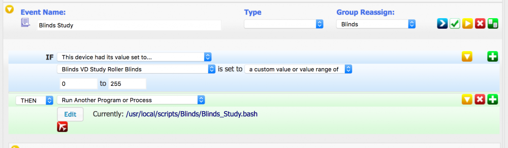 Opprett en virtual device som du kaller «Roller Blinds» og legger til rommet der du har rullegardinene. Dersom du vil bruke den med Alexa, passer du på at «Voice command» er avkrysset. Noter deg «Reference ID». Under Status Graphics, setter du det hele opp som følger (men du kan senere endre prosentknappene til å passe akkurat dine favorittposisjoner): Endre «Slider» til «Drop down» dersom du foretrekker det. Du må nå opprette en ny event: Trykk senere på «Edit» og legg til banen til der du har lagret skriptet som kommer i neste post. Poenget her er at hver gang denne virtuelle device'n settes til en verdi, kjører dette skriptet.