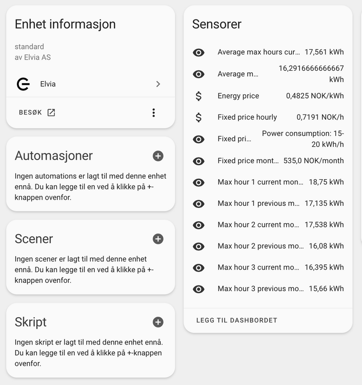 Tror jeg fant en "bakvei" til mål på dette. Lastet inn ha-elvia via HACS (den offisielle Elvia integrasjonen fant jeg ikke noe doc på, klarte ikke finne ut hvor den lagrer dataene ...). En kar på github har laget en "fixed" versjon som fungerer: https://github.com/andreabl/ha-elvia La inn denne integrasjonen. Token fra "min side" og API key fra Elvia developer portal, pluss målerpunkt ID og da fikk jeg opp alt dette: Antar jeg riktig at effektleddet kan jeg lese ut fra "max hour 3 current month"? Altså, er den > 10 så er vi på 10-15, er den > 15 så er vi på 15-20. Nå har jeg 16,3 altså derfor jeg er på 15-20 akkurat nå. Noen som vet?