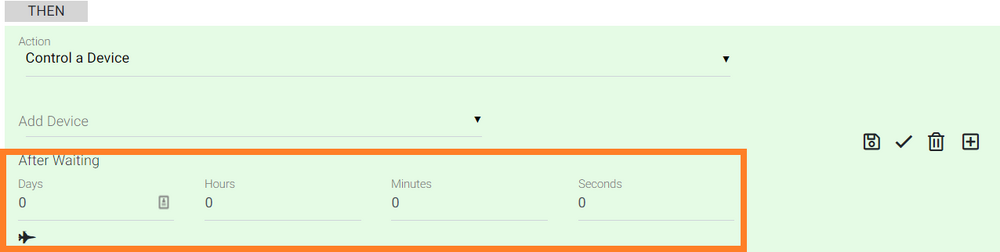 Som sagt du må bruke: En annen ting å tenke på er at hvis du skal ha et tilsvarende event kan det være lurt å dele opp eventet slik at den første delen som resetter delayed events og slår på lyset skjer når det blir detektert bevegelse og delen som slå av lyset i en separat event. Ellers kan du risikere at feks på badet så beveger du deg kanskje nok til at sensoren aldri går ut av "motion detected" og da vil lyset slå seg av etter den tiden som er spesifisert og ikke gå på igjen får du står i ro lenge nok til at sensoren går til "No motion detected" og så til "Motion detected".