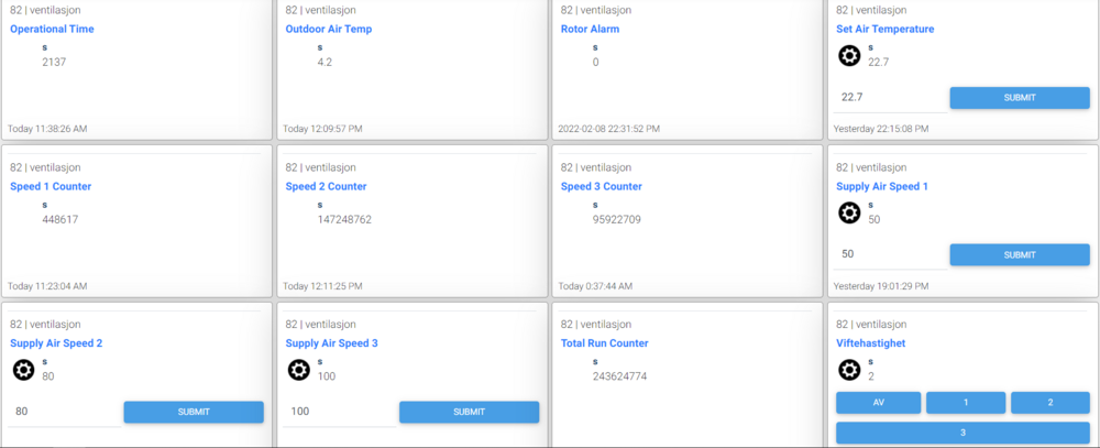 11. Hei. Link til Github Hardware brukt: Flexit CI66 Usr-Tcp232-410S Da jeg har flyttet inn i ny bolig med flexit og jeg ville styre dette via HS4 så har jeg laget et script i python som leser dataene som er satt opp i en separat fil via en modbusRTU/TCP konverter og sender det ut på MQTT. Det kan også motta kommander for å skrive, foreløpig kun til holding registers. Hvilke som kan skrives til defineres i konfigurasjonsfilen, da har man litt ekstra sikkerhet tilfelle noe galt skulle skje. Grunnen til at jeg har gjort det slik er at det krever minimalt med oppsett i toppsystemet. Feks i HS4 og mcsMQTT så oppdager den alle topicene selv og det er bare å trykke legg til, det kan i prinsippet gjøre at alle toppsystemer som støtter MQTT kan nå lese og skrive til modbus. I scriptet er den en variabel som må endres og det er "config_file" som for øyeblikket ligger på linje 12. Den skal være til configfilen som er aktiv. MQTT topic blir som følger "basetopic/{holding_registers/input_registers}/{register nummer}/{register navn}/s" den siste "s" er for "status" når det skal skrives til modbus endres denne til "c". MQTT settings er ganske selvforklarende Modbus settings: server_adress: Adressen til modbusTCP serveren/konverteren server_port: Porten som er brukt for tilkobling på serveren unit_id: Normalt er den 1 men kommer til an på implementasjonen av modbus på serversiden read_delay: Hvor lenge den venter mellom hver gang det leses oppgitt i 1/100. 50 = 500ms = 2Hz Holding og input register: "holding_registers":{ "0":{ Register nummer "name":"Supply_Air_Speed_1", Navn som brukes i MQTT topic "writeable":"True", True = kan skrives til fra MQTT, brukes kun i holding registers. Scriptet vil kun subscribe til topics hvor denne er "True" "size":"16", 16 = 16 bit = 1 register & 32 = 32 bit = 2 register "unit":"%", Foreløpig ikke brukt til noe "scaling":"1", Skalering. Verdien vil multipliseres med denne verdien før den sendes på MQTT. Og motsatt når den blir sendt fra MQTT til modbus "signed":"True" Om verdien er en "int" = True, uint = "False" }, Ting som foreløpig mangler: - Kunne skrive 32bit verdier og dele disse opp til 16bit og skrive til hvert register - Lese Discrete inputs - Lese coils - Skrive coils Hvordan det ser ut i HS4 hos meg: Eksempel konfig for flexit CI66 { "mqtt_settings":{ "server_adress":"adress", "server_port":"1883", "server_user":"username", "server_password":"password", "basetopic":"82/ventilasjon/" }, "modbus_settings":{ "server_adress":"adress", "server_port":"26", "unit_id":"1", "read_delay":"50" }, "unit_details":{ "type":"Flexit_CI66", "name":"ventilasjon" }, "holding_registers":{ "0":{ "name":"Supply_Air_Speed_1", "writeable":"True", "size":"16", "unit":"%", "scaling":"1", "signed":"True" }, "1":{ "name":"Supply_Air_Speed_2", "writeable":"True", "size":"16", "unit":"%", "scaling":"1", "signed":"True" }, "2":{ "name":"Supply_Air_Speed_3", "writeable":"True", "size":"16", "unit":"%", "scaling":"1", "signed":"True" }, "3":{ "name":"Supply_Air_Speed_4", "writeable":"True", "size":"16", "scaling":"1", "signed":"True" }, "4":{ "name":"Extract_Air_Speed_1", "writeable":"True", "size":"16", "unit":"%", "scaling":"1", "signed":"True" }, "5":{ "name":"Extract_Air_Speed_2", "writeable":"True", "size":"16", "unit":"%", "scaling":"1", "signed":"True" }, "6":{ "name":"Extract_Air_Speed_3", "writeable":"True", "size":"16", "unit":"%", "scaling":"1", "signed":"True" }, "7":{ "name":"Extract_Air_Speed_4", "writeable":"True", "size":"16", "scaling":"1", "signed":"True" }, "8":{ "name":"Set_Air_Temperature", "writeable":"True", "size":"16", "unit":"°C", "scaling":"10", "signed":"True" }, "9":{ "name":"Supply_Air_Min_Temp", "writeable":"True", "size":"16", "unit":"°C", "scaling":"10", "signed":"True" }, "10":{ "name":"Supply_Air_Max_Temp", "writeable":"True", "size":"16", "unit":"°C", "scaling":"10", "signed":"True" }, "11":{ "name":"Cooling_Outdoor_Air_Min_temp", "writeable":"True", "size":"16", "unit":"°C", "scaling":"10", "signed":"True" }, "12":{ "name":"Forced_Vent_Speed", "writeable":"True", "size":"16", "scaling":"1", "signed":"True" }, "13":{ "name":"Forced Vent_Time", "writeable":"True", "size":"16", "unit":"min", "scaling":"1", "signed":"True" }, "14":{ "name":"Air_Regulation_Type", "writeable":"True", "size":"16", "unit":"bool", "scaling":"1", "signed":"True" }, "15":{ "name":"Cooling_Active", "writeable":"True", "size":"16", "unit":"bool", "scaling":"1", "signed":"True" }, "16":{ "name":"Forced_Ventilation", "writeable":"True", "size":"16", "unit":"bool", "scaling":"1", "signed":"True" }, "17":{ "name":"Set_Air_Speed", "writeable":"True", "size":"16", "scaling":"1", "signed":"True" }, "18":{ "name":"Time", "writeable":"False", "size":"32", "unit":"s", "scaling":"1", "signed":"False" }, "21":{ "name":"Fire_Smoke_Mode", "writeable":"True", "size":"16", "scaling":"1", "signed":"True" } }, "input_registers":{ "6":{ "name":"Time_1", "writeable":"False", "size":"32", "signed":"False" }, "8":{ "name":"Filter_Time", "writeable":"False", "size":"16", "signed":"False" }, "9":{ "name":"Supply_Air_temp", "writeable":"False", "size":"16", "unit":"°C", "scaling":"10", "signed":"True" }, "10":{ "name":"Extract_Air_temp", "writeable":"False", "size":"16", "unit":"°C", "scaling":"10", "signed":"True" }, "11":{ "name":"Outdoor_Air_temp", "writeable":"False", "size":"16", "unit":"°C", "scaling":"10", "signed":"True" }, "14":{ "name":"Heat_Exchanger", "writeable":"False", "size":"16", "unit":"%", "signed":"False" }, "17":{ "name":"Operational_Time", "writeable":"False", "size":"16", "unit":"%", "signed":"False" }, "26":{ "name":"Rotor_Alarm", "writeable":"False", "size":"16", "signed":"False" }, "27":{ "name":"Filter_Alarm", "writeable":"False", "size":"16", "signed":"False" }, "28":{ "name":"Heating_Active", "writeable":"False", "size":"16", "signed":"False" }, "32":{ "name":"Speed_1_counter", "writeable":"False", "size":"32", "signed":"False" }, "34":{ "name":"Spe