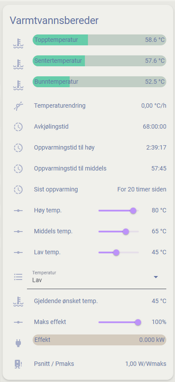 Jeg har målt varmetapet på min VVB og den er: tap(W) = 2000(0.00135 * t - 0.0384). Dette gjelder for meg der tanken står i et vaskerom på 20grader C. Er det kaldere, som feks i en uisolert kjeller, er tapet større. Så ved 50grader C er tapet 58W og ved 80grader C er tapet 139W. Forskjellen utgjør 709kWt pr år. Med dagens strømpris er det altså litt å spare på å senke temperaturen. 50 grader er nok til at legionella ikke utvikler seg ukontrollert, men de dør ikke heller så jeg varmer opp tanken til 80 grader C to-tre ganger i måneden. Jeg har en OSO tank med OSO sin temperaturfølerstav. Denne er koblet til en esp8266 så jeg har full kontroll på temperatur på 3 steder i tanken. Når den er så lav som 45-50 grader så er det viktig å ha kontroll på det for at temperaturen ikke kommer under dusjvarmt. Temperaturen synker litt på vei til dusj så jeg har funnet ut at 45 grader i VVB er absolutt laveste jeg kan ha uten at noen i huset klager.- 16 svar