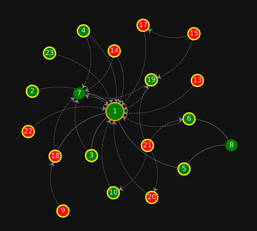 @iblisJodda, spørre kan man 😄 Mitt z-wave -nett er ganske spredt, jeg vil se hvor routingen tar veien og om det er mye re-sending pga. dårlig signal. Aeotec -stikkene min fikk korupt nv-ram på ett eller annet vis, og en av stikkene fikk en form for kontaktfeil. Jeg anskaffet meg derfor noen UZB1 og måtte sette opp nettet på nytt. Dette er jeg ikke ferdig med, og ønsker å sette inn riktige remedier på riktig plass. Dessuten er eg utdannet innen elektronikk og digitalteknikk med tilhørende feilsøking. Jeg føler meg naken uten verktøy. Akkurat nå ser nettet slik ut: (Det må være noe støy ett sted, offline noder er i nærheten av stikka). Stiplete linjer er noder som ser den andre (ved "healing"), men ikke motsatt. Ja, nettet mitt er altfor magert enda, må ha flere noder for å få ett stabilt mesh.