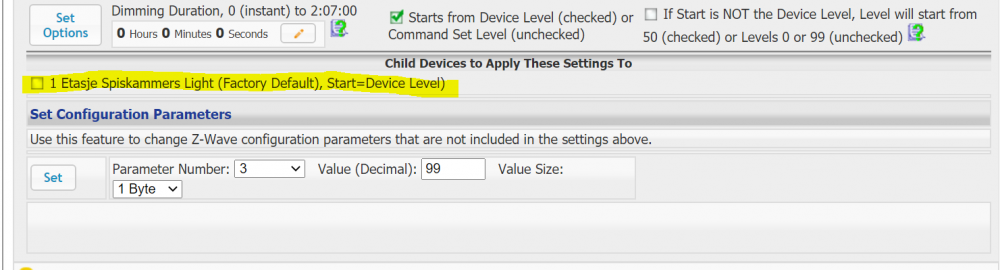 Heisann, Jeg driver å justerer nedre og øvre lysverdi for Heatit Z-DIM firmware versjon 1.0. Parametre 2 og 3. Det jeg gjør er å skru dimmeren ned slik at det knappt lyser, og går på parameter 2 og setter den til 1. Så skrur jeg opp dimmeren slik at lyset akkurat maks, uten og dra hjulet noe mere enn nødvendig. Setter så parameter 3 til 99. Dette funker ikke da prosenten på Homeseer ikke er tilmærmet 0% ved svakt lys, og heller ikke tilnærmet 100% når jeg dimmer opp og stopper når det maks lys i pæra. Verdiene blir helt på vidvanke Helt sikkert noe jeg gjør feil, men er det noen som kan dette? Jeg har satt parameter 1 til 2, da pæra er LED 2watt. Hva betyr det jeg har gulet ut nedenfor, hva sjer hvis den blir huket av? Fra Heatit: 9. CALIBRATION Heatit Z-Dim may need to be calibrated after installation. To get the Heatit Z-Dim dimmer calibrated the following procedure should be performed after installation. 1. Add the dimmer to your Z-Wave network as described in Paragraph 4 “Add/Remove”. 2. Turn the wheel counterclockwise to get the lowest brightness level. 3. Adjust Parameter 2 ”Minimum Dim level” according to your needs. 4. Turn the wheel clockwise to get the highest brightness level. 5. Adjust Parameter 3 ”Maximum Dim level” according to your needs. Parameter 2, Parameter Size 1. Minimum Dim level. The parameter defines the lowest dimming level of the dimmer. The value must be lower than parameter 3 ”Maximum Dim Level”. VALUE DESCRIPTION 1 - 98 1% - 98% Default is 20 (20%) Parameter 3, Parameter Size 1. Maximum Dim level. The parameter defines the highest dimming level of the dimmer. The value must be higher than parameter 2 ”Minimum Dim Level”. VALUE DESCRIPTION 2 - 99 2% - 99% Default is 85 (85%) P