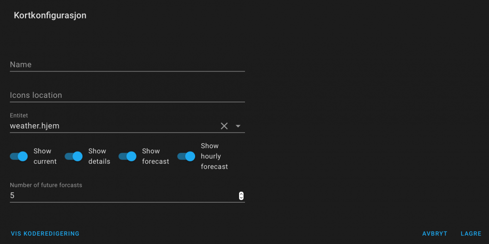15. Jeg har brukt "Weather card" fra HACS istedefor det vanlige kortet, men etter at jeg har oppdatert home assistant får jeg ikke opp dette kortet. Noen som vet hva feilen er. Har prøvd å reinstallere men funker ikke.