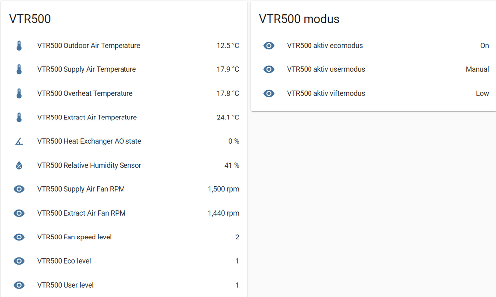 Jeg har en VTR500 selv og kommunisere med HA modbus (https://www.home-assistant.io/integrations/modbus/) ved hjelp av en Systemair IAM over modbus/tcp. For mitt oppsett måtte modbus adressene i Modbus Variable List dokumentet substraheres med -1 dvs at 12401 må bli 12400. Ser ingen direkte feil i esphome modbus konfigurasjonen, men dokumentasjonen sier at det er modbus/rtu som skal brukes. Protokoll er RS485. Regner med at du har lest denne artikkelen her. Her er mitt oppsett: modbus: - name: VTR500 type: tcp host: 10.0.0.107 port: 502 delay: 2 sensors: - name: "VTR500 Outdoor Air Temperature" unit_of_measurement: °C device_class: temperature slave: 1 address: 12101 scale: 0.1 precision: 1 data_type: int16 scan_interval: 30 - name: "VTR500 Supply Air Temperature" unit_of_measurement: °C device_class: temperature slave: 1 address: 12102 scale: 0.1 precision: 1 data_type: int16 scan_interval: 30 - name: "VTR500 Overheat Temperature" unit_of_measurement: °C device_class: temperature slave: 1 address: 12107 scale: 0.1 precision: 1 data_type: int16 scan_interval: 30 - name: "VTR500 Extract Air Temperature" unit_of_measurement: °C device_class: temperature slave: 1 address: 12543 scale: 0.1 precision: 1 data_type: uint16 scan_interval: 30 - name: "VTR500 Heat Exchanger AO state" unit_of_measurement: '%' device_class: power_factor slave: 1 address: 14102 data_type: uint16 scan_interval: 30 - name: "VTR500 Relative Humidity Sensor" unit_of_measurement: '%' device_class: humidity slave: 1 address: 12135 data_type: uint16 scan_interval: 30 - name: "VTR500 Supply Air Fan RPM" unit_of_measurement: 'rpm' slave: 1 address: 12400 data_type: uint16 scan_interval: 30 - name: "VTR500 Extract Air Fan RPM" unit_of_measurement: 'rpm' slave: 1 address: 12401 data_type: uint16 scan_interval: 30 - name: "VTR500 Fan speed level" slave: 1 address: 1130 - name: "VTR500 Eco level" slave: 1 address: 2504 data_type: uint16 scan_interval: 30 - name: "VTR500 User level" slave: 1 address: 1160 data_type: uint16 scan_interval: 30 template: - sensor: - name: "VTR500 aktiv viftemodus" state: > {% set usermode = states('sensor.vtr500_fan_speed_level')|int(0) %} {% set options = ['Off', 'Off(1)', 'Low', 'Normal', 'High'] %} {{options[usermode]}} - name: "VTR500 aktiv ecomodus" state: > {% set usermode = states('sensor.vtr500_eco_level')|int(0) %} {% set options = ['Off', 'On'] %} {{options[usermode]}} - name: "VTR500 aktiv usermodus" state: > {% set usermode = states('sensor.vtr500_user_level')|int(0) %} {% set options = ['Auto', 'Manual', 'Crowded', 'Refresh', 'Fireplace', 'Away', 'Holiday', 'Cooker Hood', 'Vacuum Cleaner'] %} {{options[usermode]}} Slik ser mitt oppsett ut i Lovelace:- 74 svar