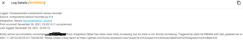 @daniel.h.iversen Jeg får denne meldingen "Entity sensor.accumulated_consumption_<location> from integration tibber has state class total_increasing, but its state is not strictly increasing." i HA loggen. Det er jo den nye HA Energy modulen som gir denne meldingen, men er det noe du kan gjøre for å unngå denne meldingen i loggen? Det er jo forøvrig ikke noe stort problem da den loggen bare en gang, men likevel jeg vil bare spørre. Log: https://gist.github.com/overas/72a144d2009bf644f322b20051fae6ba