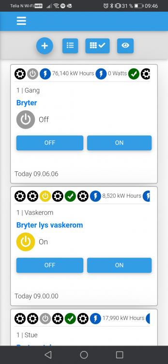 Sliter enda med å få lys i gang/trapp til å fungere. Prøver stadig nye varianter i oppsett. Siste nå er at kunstig knapp for felles lys slår av både trapp og hall. Hall virker som det skal med lys av på ved bevegelse. Men bevegelse trumfer lys på. Så har ikke hatt lys på dagtid i hall siste måned. Straks jeg slår det på, går det av. Er usikker på om det rett og slett er en konfigurasjon på selve bryter som er problemet. Under devices, ser jeg bryteren og kan slå den av og på. Men hva slår den av og på tro? Jeg ønsker at device for bryter kunne hatt to knapper. En for trapp oppe og en for hall. Er dette mulig å få til tro?
