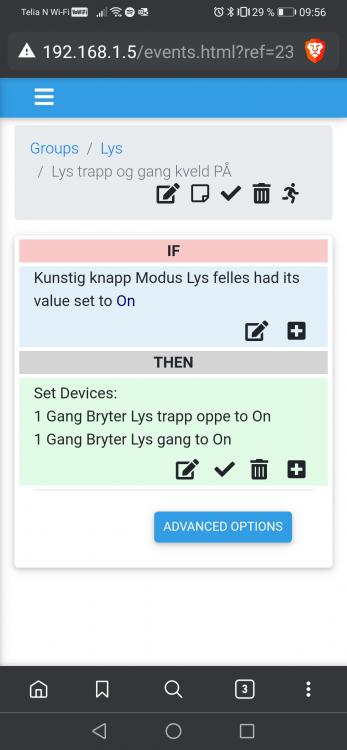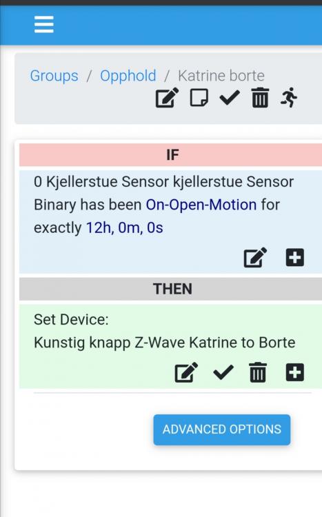 Krangler enda med lysstyring i gangen, men er blitt noe klokere tror jeg. Å fålyset på ved bevegelse i trappa om natta er ikke mulig så lenge felles lys knapp er av. Jeg rekker ikke å se lyset tenne før hovedregel slår det av. Må da velge mellom tidstyring eller bevegelse. Kan jo si at lyset skal være på 1t etter bevegelse for så gå av. Kjedelig å ha det mørkt i gangen når vi er hjemme og våkne. Får gruble på det. Uansett må alt inn i samme event for å ikke krasje. I allfall ikke sett noe annet som løser det.