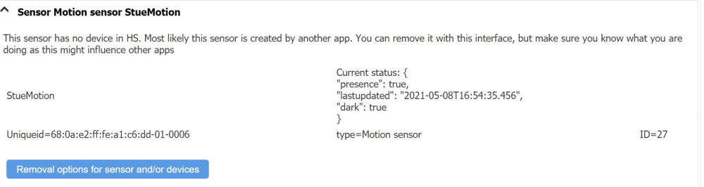 1. Konge. Jeg spurte Wim og fekk svar kjapt som du sa. Feilen min var at jeg brukte Jowiehue plugging fra HS3. Det er en egen Jowihue for HS4. Dette gjorde jeg ikke da eg migrerte til HS4 for et år siden. Alt bare fungerte når jeg installerte HS4 pluggin som egentlig overskriv HS3 pluggin og beholdt alt innhold Ikea Motion sensor fekk seg device i HS. Takk for tips Mvh Marius