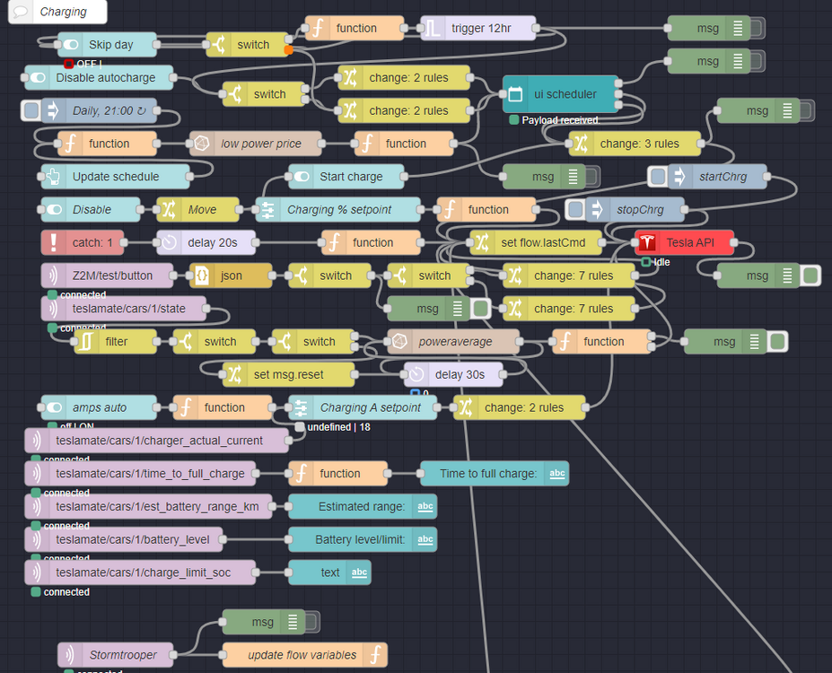 Jeg har også Agder Energi. Har jo endel spesifikt til mitt oppsett for å få dette til å fungere her. Bruker status fra Teslamate for å starte logikken når bilen lader (https://github.com/adriankumpf/teslamate). Så leser jeg ut gjennomsnitt forbruk fra InfluxDB, og leser ut momentan-forbruk fra HAN til MQTT adapteret, lagret i nodered som en global variabel (AMSleser.no). Så henter jeg spenningen til laderen direkte fra laderen som jeg henter til flow variabler fra InfluxDB. Her er alt i hvertfall: Alt som har med lading av bilen å gjøre ser slik ut... Begynner å bli rimelig uoversiktlig.