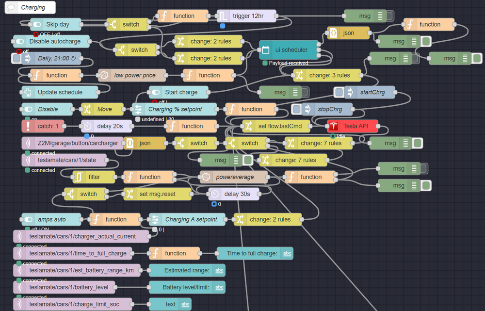 Jeg er mye mer komfortabel med javascript enn YAML også. Men, det kan bli rimelig uoversiktlig og rotete i nodered også altså. Dette er bare for å lade en bil... Og det er ikke ferdig, mangler noen funksjoner jeg gjerne ville hatt.