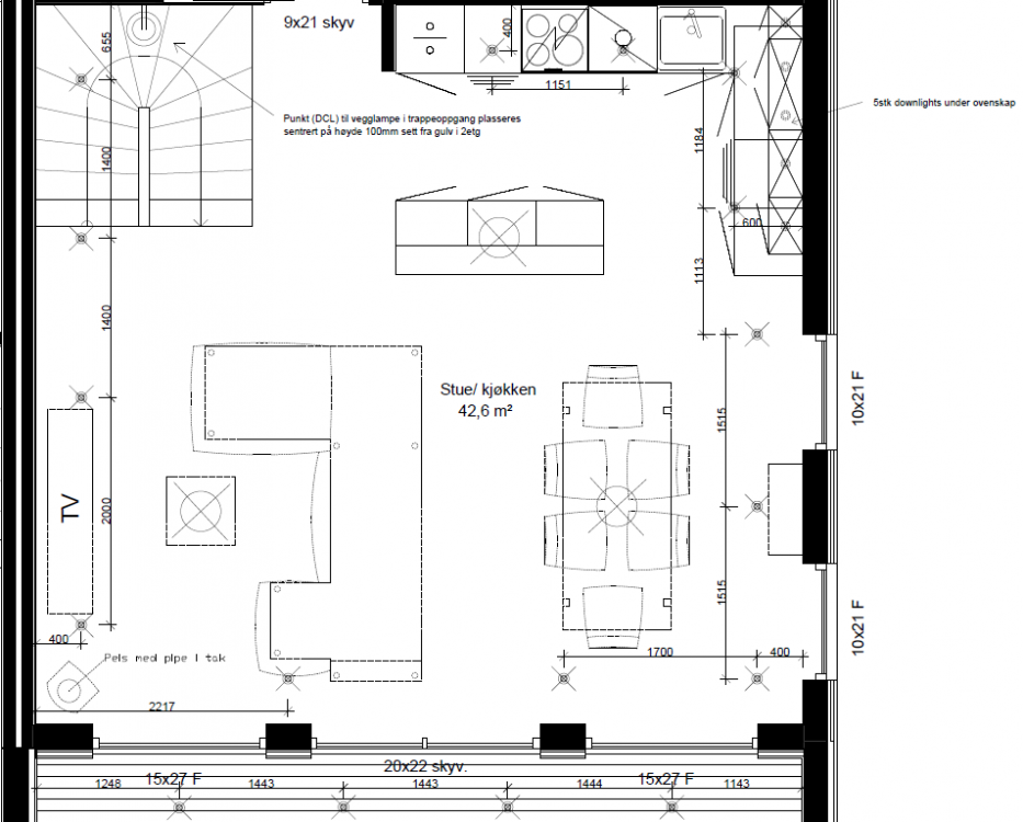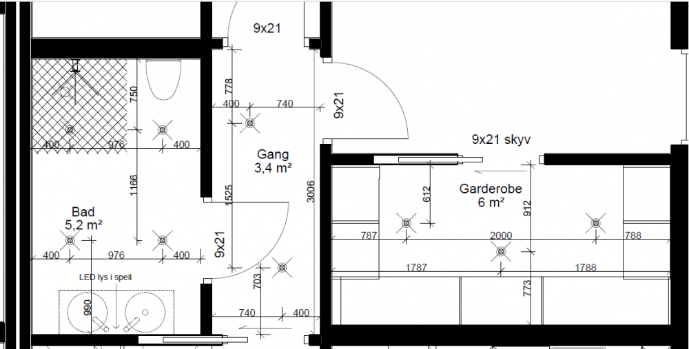Ditt synspunkt verdsetter jeg mye for det er basert på sunt fornuft og erfaring Alt du skrev høres veldig rimelig ut! Jeg tok dine meninger i betraktning og tilpasset tegningene litt, flott om du kan kikke litt på de I nøtteskall er plassering på begge bad litt annerledes nå, med en ekstra DL. I stue/kjøkken har jeg brukt en til på trapperom og i kjøkken, endret litt på plassering og la en til. De to over vask er nå litt nærmere veggen (40 cm mot 30) og to foran ovenskap litt lengre bort fra veggen (60 cm mot 50 cm) pga ovenskap og 5 spotter under den. På lekerom/TV-stue tok jeg hensyn til plassering av TV-en og plassering av DL er nå helt annerledes! Det er 2 nye rom på tegningene nå, vindfang og garderobe, med tenkt plassering. Det var stort sett alle rom med DL, ikke noe på soverom. Har du noe å si om 2700K vs 3000K på bad? Jeg leste noen steder at det sterk anbefales bruk av 3000K på bad, men ikke sikkert hvorfor Bruker du Unilamp, SG eller noe annet? Igjen, takk for innspill
