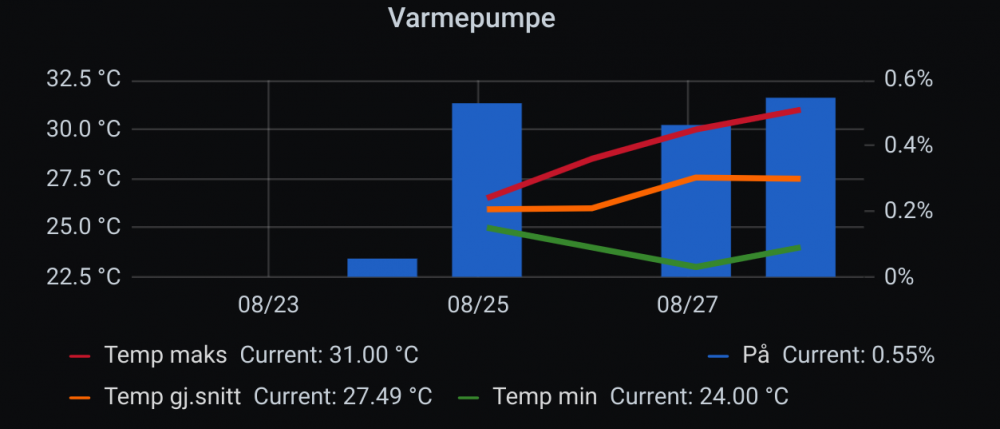 Jeg prøver det ut nu. Har en varmepumpe som registrerer bla romtemperatur og hvor mye den har kjørt (varmet/kjølt i % av døgnets tid) i influxdb. Viser i Grafana med: SELECT mean(value) FROM running GROUP BY time(1d) #viser prosent av dagen den har kjørt (varmet, kjølt) SELECT MAX(roomTemperature) FROM heatpump GROUP BY time(1d) #max temperatur SELECT mean(roomTemperature) FROM heatpump GROUP BY time(1d) #gj.snittstemp SELECT MIN(roomTemperature) FROM heatpump GROUP BY time(1d) # min temp Den har kun kjørt et par dager. Nu lurer jeg svært på hva slags retention jeg kan bruke for at dette skal virke i årevis....