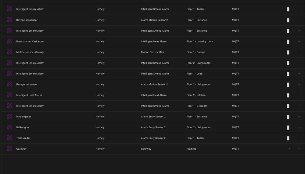 Kan du se om det andre enhetene dukker opp i homeassistant-loggen? Hvis du åpner `https://din-home-assistant/config/mqtt` skal du kunne lytte på events. Hvis du lytter på `homeassistant/#`, og restarter homely i portainer, og se om det dukker opp meldinger om mer enn de 4 enhetene. Hvis det dukker opp flere, er det fint om du kan sende meg den payloaden. Ellers, kan du sende meg logg-output (hvis du setter loglevel til debug) over alle enhetene dine? Disse logges ut like etter henting. Fjern gjerne serienr etc hvis du ikke vil sende disse, men hos meg dukker alle enheter opp, så kan virke som det er noen enheter jeg ikke har hjemme hos meg som lager krøll - jeg får opp alt av sensorer, gateway status etc.