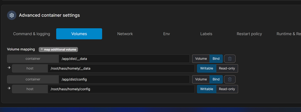 Helt nederst når du oppretter containeren, kan du legge inn volumes: nå er jeg usikker på hvilket miljø du kjører containerene dine i, men hvis du har tilgang på filsystemet så lager du deg en mappe ett sted, legger inn en config fil, og legger den inn i "host". Ett annet alternativ er å legge inn hele configen din som en miljøvariabel: https://github.com/node-config/node-config/wiki/Environment-Variables#node_config Med andre ord vil du da sette "NODE_CONFIG" til dette (med dine egne verdier for host, brukernavn etc): {"database":{"logLevel":"debug","reset":true,"connection":{"username":"user","password":"password","storage":"db.sqlite","host":"localhost","dialect":"sqlite"}},"mqtt":{"enabled":false,"qos":1,"host":"mqtt://192.168.86.38:1883","user":"homely","entityPrefix":"homely","topicPrefixes":{"config":"homeassistant","state":"homely"}},"homely":{"host":"sdk.iotiliti.cloud"},"logLevel":"info","polling":{"schedule":"*/5 * * * *"}} Håper dette hjelper deg litt på veien. Jeg har ment å lage en addon utav dette, men jeg har rett og slett ikke hatt tid, siden jeg må sette opp en ekstra home assistant instans her hjemme på en raspberry pi. Hvis noen andre har tid og anledning til å se på det, kan jeg gjerne legge dette inn i github repoet så folk kan komme enklere i gang.. 🙂