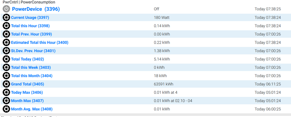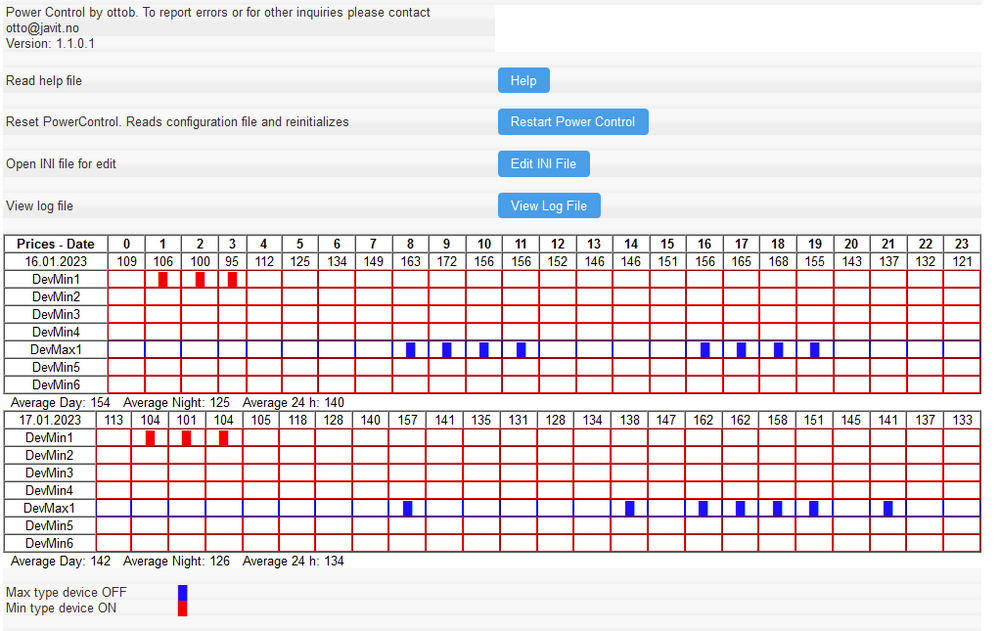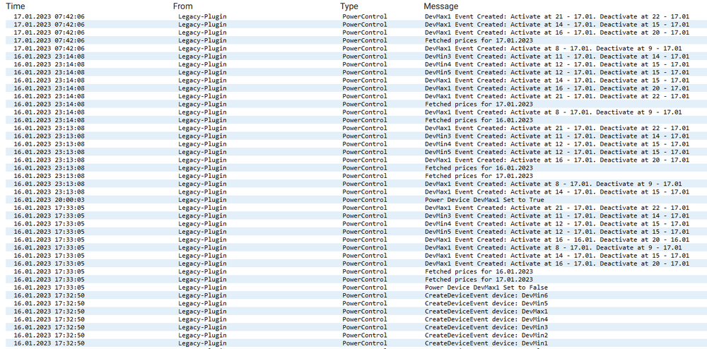 Eg får fremdeles ikkje dette til å virke 100%, godt mulig at eg ikkje ser «skogen for bare trær»... DevMin2 har ein limit på 200 øre og det er vel fult mulig å få 8 sammenhengende timer her, både i dag (16.1) og i morgen (17.1). Likevel blir det ikkje generert noen events. DevMin1 fungerer heilt fint, den finner dei 3 timene med lavest strøm mellom klokka 22:00 og 06:00. DevMin3 er ein kopi av DevMin1, med unntak av timespan frå 07:00 til 17:00, likevel virker ikkje DevMin3 som forventet. DevMin4 og DevMin5 har begge timespan mellom 12:00 og 21:00, forskjellen er «Use24average som er henholdsvis «false» og "true". Verken DevMin4 eller DevMin5 genererer events selv om "mandatory=true". Og eg skjønner heller ikkje hvorfor DevMin6 ikkje generer events. Neste steg blir å stoppe plugin, slette alle devicer og starte plugin igjen. Kanskje devicer må slettes og genereres på nytt ved oppdateringer av powercontrol? [DevMin1] DeviceMaxType=False ValidMaxPointLimit=5 AbsoluteLimit=False Priority=7 Power=2000 IgnoreLimit=500 Floor=PwrCntrl Room=Elbil MinLength=3 Merge=False TimespanStart=22 TimespanEnd=6 Mandatory=True Use24average=False UsePowerSupportLimit=False [DevMin2] DeviceMaxType=False ValidMaxPointLimit=200 AbsoluteLimit=True MinLength=8 StretchMin=2 Priority=7 Power=2000 IgnoreLimit=500 Floor=PwrCntrl Room=Gulvvarme DefAct0=23 DefDeAct0=5 [DevMin3] DeviceMaxType=False ValidMaxPointLimit=5 AbsoluteLimit=False Priority=7 Power=2000 IgnoreLimit=500 Floor=PwrCntrl Room=Test3 MinLength=3 Merge=False Timespanstart=7 TimespanEnd=17 Mandatory=True Use24average=False UsePowerSupportLimit=False [DevMin4] DeviceMaxType=False ValidMaxPointLimit=5 AbsoluteLimit=False Priority=7 Power=2000 IgnoreLimit=500 Floor=PwrCntrl Room=Dag MinLength=3 Merge=False TimespanStart=12 TimespanEnd=21 Mandatory=True Use24average=False UsePowerSupportLimit=False [DevMin5] DeviceMaxType=False ValidMaxPointLimit=5 AbsoluteLimit=False Priority=7 Power=2000 IgnoreLimit=500 Floor=PwrCntrl Room=Test5 MinLength=3 Merge=False TimespanStart=12 TimespanEnd=21 Mandatory=True Use24average=True UsePowerSupportLimit=False [DevMin6] DeviceMaxType=False Priority=7 Power=2000 IgnoreLimit=500 Floor=PwrCntrl Room=Test6 MinLength=3 Merge=False Mandatory=False Use24average=False UsePowerSupportLimit=True [DevMax1] DeviceMaxType=True MaxShutoff=4 TotalMaxShutoff=8 ValidMaxPointLimit=2 AbsoluteLimit=False CheckShoulderHeight=False IgnoreLimit=0 Priority=1 Power=2000 Floor=PwrCntrl Room=VVB DefAct0=6 DefDeAct0=11 DefAct1=16 DefDeAct1=19 Use24average=True UsePowerSupportLimit=True