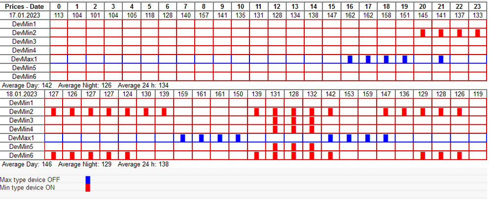 Driver og tester litt for praktisk bruk. Skjønner ikkje heilt det som skjer med DevMin2 her: [DevMin2] DeviceMaxType=False ValidMaxPointLimit=100 AbsoluteLimit=True MinLength=8 StretchMin=2 Priority=7 Power=2000 IgnoreLimit=500 Floor=PwrCntrl Room=Gulvvarme DefAct0=23 DefDeAct0=5 Den er satt til MinLenght=8 og da skal vel periode under prisgrense (her 100 øre) være sammenhengende 8 timer? Her er perioden 7 timer selv om stretchMin er satt til 2 timer, ein skulle vel forvente at perioden da ble strekt til klokka 09:00 (eller fra 01:00 til 08:00) for å få 8 timer sammenhengende? Og den ene ON-perioden klokka 22:00, hvor kommer den fra? Er det strekke funksjonen som feilaktig legger inn den utenom resten av bolken?