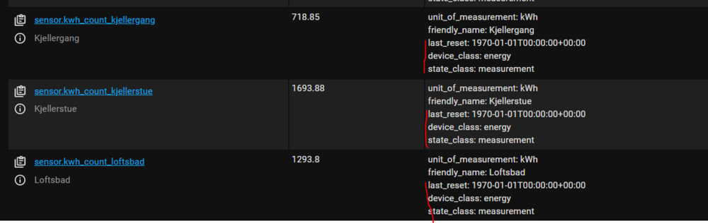 Det som skjer her er at alle entities som slutter på _energy vil få de tre attributtene vi snakker om. Jeg har selv en del "gamle" heatit termostater som ikke gir med energimåling, der jeg regner dette for å få en kWh teller, som igjen trenger disse attributtene for å "virke" i energi dashboardet: Det er mer ryddig å gjøre det i en template, men som stigvi er inne på så er det kanskje ikke rett frem. customize er mer en "nødløsning" men det funker.