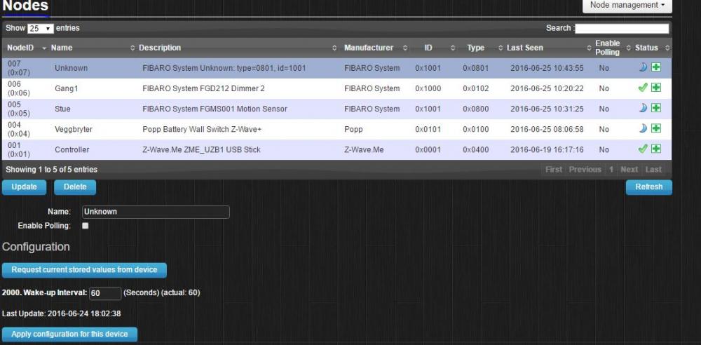 Kjøpte min andre FibaroFGMS-001 multisensor her for noen dager siden, men når jeg skal inkludere den på Domoticzen får jeg opp de ulike sensorer under Device tab'n, Men under Hardware og UZB-1, så kommer den opp som unkown og får ikke tilgang til alle de forskjellige parametere. Første jeg installerte gikk som smurt. Prøvd å slette den et par ganger. vekke den opp uante ganger også prøvd request current stored values. Noen som har noen tips/vært borti lignende? Edit: Fikk løsningen på domoticz forumet. Måtte inn i manufacturer_specific.xml (domoticz/config) og kopiere linjen til den første FGMS001'en og lime den inn igjen under og erstatte 0800 med 0801 (Type)