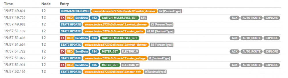 Ble mye logging såklart 2020-11-23 19:57:38.974 [DEBUG] [nal.protocol.ZWaveTransactionManager] - Transaction SendNextMessage 0 out at start. Holdoff false. 2020-11-23 19:57:49.691 [DEBUG] [ding.zwave.handler.ZWaveThingHandler] - NODE 12: Command received zwave:device:5727c0c5:node12:switch_dimmer --> 62 [PercentType] 2020-11-23 19:57:49.696 [DEBUG] [ss.ZWaveMultiLevelSwitchCommandClass] - NODE 12: Creating new message for command SWITCH_MULTILEVEL_SET 2020-11-23 19:57:49.700 [DEBUG] [ng.zwave.internal.protocol.ZWaveNode] - NODE 12: SECURITY NOT required on COMMAND_CLASS_SWITCH_MULTILEVEL 2020-11-23 19:57:49.704 [DEBUG] [ng.zwave.internal.protocol.ZWaveNode] - NODE 12: Command Class COMMAND_CLASS_SWITCH_MULTILEVEL is NOT required to be secured 2020-11-23 19:57:49.709 [DEBUG] [nal.protocol.ZWaveTransactionManager] - NODE 12: Adding to device queue 2020-11-23 19:57:49.713 [DEBUG] [nal.protocol.ZWaveTransactionManager] - NODE 12: Added 835 to queue - size 3 2020-11-23 19:57:49.718 [DEBUG] [nal.protocol.ZWaveTransactionManager] - Transaction SendNextMessage 0 out at start. Holdoff false. 2020-11-23 19:57:49.724 [DEBUG] [wave.internal.protocol.SerialMessage] - Assembled message buffer = 01 0A 00 13 0C 03 26 01 3E 25 B6 63 2020-11-23 19:57:49.729 [DEBUG] [ing.zwave.handler.ZWaveSerialHandler] - NODE 12: Sending REQUEST Message = 01 0A 00 13 0C 03 26 01 3E 25 B6 63 2020-11-23 19:57:49.736 [DEBUG] [WaveSerialHandler$ZWaveReceiveThread] - Receive Message = 06 2020-11-23 19:57:49.734 [DEBUG] [ing.zwave.handler.ZWaveSerialHandler] - Message SENT 2020-11-23 19:57:49.743 [DEBUG] [nal.protocol.ZWaveTransactionManager] - processReceiveMessage input 0<>128 : Message: class=null[0], type=ACK[2], dest=255, callback=0, payload= 2020-11-23 19:57:49.747 [DEBUG] [nal.protocol.ZWaveTransactionManager] - Received msg (0): Message: class=null[0], type=ACK[2], dest=255, callback=0, payload= 2020-11-23 19:57:49.749 [DEBUG] [WaveSerialHandler$ZWaveReceiveThread] - Receive Message = 01 04 01 13 01 E8 2020-11-23 19:57:49.752 [DEBUG] [nal.protocol.ZWaveTransactionManager] - lastTransaction null 2020-11-23 19:57:49.751 [DEBUG] [nal.protocol.ZWaveTransactionManager] - Transaction SendNextMessage started: TID 835: [WAIT_RESPONSE] priority=Set, requiresResponse=true, callback: 182 2020-11-23 19:57:49.756 [DEBUG] [nal.protocol.ZWaveTransactionManager] - Received msg: ACK 2020-11-23 19:57:49.756 [DEBUG] [nal.protocol.ZWaveTransactionManager] - processReceiveMessage input 0<>128 : Message: class=SendData[19], type=Response[1], dest=255, callback=0, payload=01 2020-11-23 19:57:49.763 [DEBUG] [nal.protocol.ZWaveTransactionManager] - ZWaveReceiveThread queue empty 2020-11-23 19:57:49.767 [DEBUG] [WaveSerialHandler$ZWaveReceiveThread] - Receive Message = 01 07 00 13 B6 00 00 02 5F 2020-11-23 19:57:49.772 [DEBUG] [nal.protocol.ZWaveTransactionManager] - processReceiveMessage input 1<>127 : Message: class=SendData[19], type=Request[0], dest=0, callback=182, payload=B6 00 00 02 2020-11-23 19:57:49.775 [DEBUG] [nal.protocol.ZWaveTransactionManager] - Transaction SendNextMessage 1 out at start. Holdoff false. 2020-11-23 19:57:49.784 [DEBUG] [ding.zwave.handler.ZWaveThingHandler] - NODE 12: Polling initialised at 86400 seconds - start in 1500 milliseconds. 2020-11-23 19:57:49.788 [DEBUG] [nal.protocol.ZWaveTransactionManager] - Received msg (1): Message: class=SendData[19], type=Response[1], dest=255, callback=0, payload=01 2020-11-23 19:57:49.796 [DEBUG] [WaveSerialHandler$ZWaveReceiveThread] - Receive Message = 01 0A 00 04 00 0C 04 26 01 3E FF 1F 2020-11-23 19:57:49.798 [DEBUG] [nal.protocol.ZWaveTransactionManager] - lastTransaction TID 835: [WAIT_RESPONSE] priority=Set, requiresResponse=true, callback: 182 2020-11-23 19:57:49.813 [DEBUG] [nal.protocol.ZWaveTransactionManager] - Checking outstanding transactions: 1 2020-11-23 19:57:49.815 [DEBUG] [nal.protocol.ZWaveTransactionManager] - processReceiveMessage input 1<>127 : Message: class=ApplicationCommandHandler[4], type=Request[0], dest=12, callback=0, payload=00 0C 04 26 01 3E FF 2020-11-23 19:57:49.817 [DEBUG] [nal.protocol.ZWaveTransactionManager] - Last transaction: TID 835: [WAIT_RESPONSE] priority=Set, requiresResponse=true, callback: 182 2020-11-23 19:57:49.829 [DEBUG] [ve.internal.protocol.ZWaveController] - Incoming Message: Message: class=SendData[19], type=Response[1], dest=255, callback=0, payload=01 2020-11-23 19:57:49.838 [DEBUG] [l.serialmessage.SendDataMessageClass] - NODE 12: sentData successfully placed on stack. 2020-11-23 19:57:49.843 [DEBUG] [nal.protocol.ZWaveTransactionManager] - TID 835: Advanced to WAIT_REQUEST 2020-11-23 19:57:49.849 [DEBUG] [nal.protocol.ZWaveTransactionManager] - NODE 12: TID 835: Transaction not completed 2020-11-23 19:57:49.855 [DEBUG] [nal.protocol.ZWaveTransactionManager] - Received msg (1): Message: class=SendData[19], type=Request[0], dest=0, callback=182, payload=B6 00 00 02 2020-11-23 19:57:49.861 [DEBUG] [nal.protocol.ZWaveTransactionManager] - lastTransaction TID 835: [WAIT_REQUEST] priority=Set, requiresResponse=true, callback: 182 2020-11-23 19:57:49.868 [DEBUG] [nal.protocol.ZWaveTransactionManager] - Checking outstanding transactions: 1 2020-11-23 19:57:49.872 [DEBUG] [nal.protocol.ZWaveTransactionManager] - Last transaction: TID 835: [WAIT_REQUEST] priority=Set, requiresResponse=true, callback: 182 2020-11-23 19:57:49.876 [DEBUG] [nal.protocol.ZWaveTransactionManager] - Checking TID 835: (Callback 182) 2020-11-23 19:57:49.885 [DEBUG] [.serialmessage.ZWaveCommandProcessor] - Callback match! 2020-11-23 19:57:49.890 [DEBUG] [nal.protocol.ZWaveTransactionManager] - Correlated to TID 835: callback 182 2020-11-23 19:57:49.897 [DEBUG] [ve.internal.protocol.ZWaveController] - Incoming Message: Message: class=SendData[19], type=Request[0], dest=0, callback=182, payload=B6 00 00 02 2020-11-23 19:57:49.901 [DEBUG] [l.serialmessage.SendDataMessageClass] - NODE 12: SendData Request. CallBack ID = 182, Status = Transmission complete a