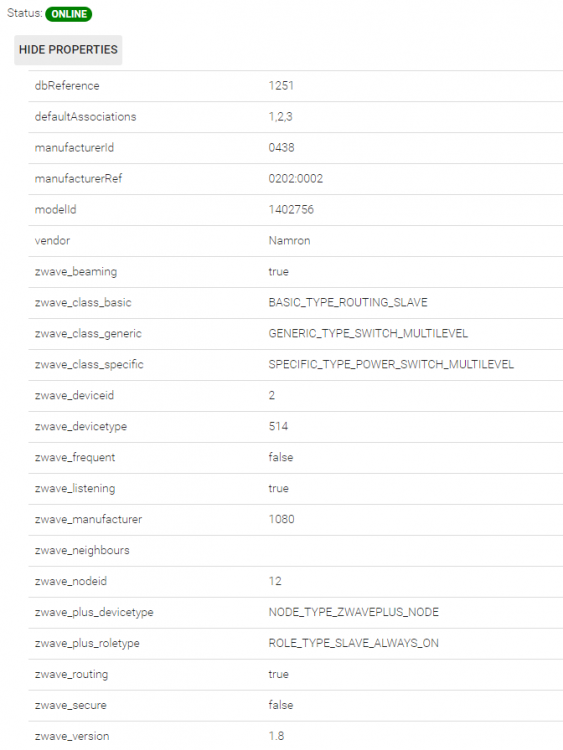 Namron er i hvertfall nærme nok til å oppdatere Openhab i sanntid når jeg vrir på hjulet. Nå har Dimmeren 13 naboer, og får fortsatt ikke tilbake ny verdi fra dimmeren når jeg endrer via openhab. (har testet med både OpenHab-appen og Paperui) Jeg er litt usikker på hvordan jeg aktivere debugging her.. Duwi dimmerne mine gjør motsatt. De sender ingenting til openhab når jeg manuelt dimmer lyset. Men Openhab får beholde ny verdi, når jeg dimmer via OH. (Dette er et nytt system som er satt opp denne helgen)