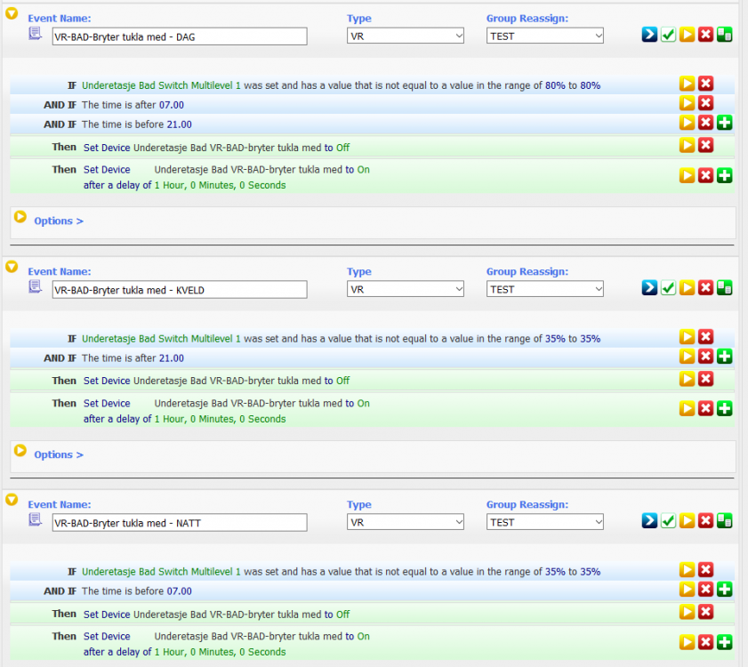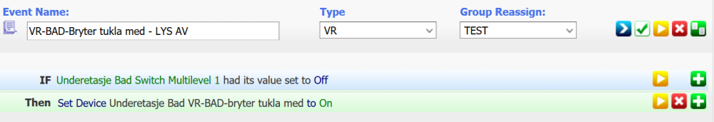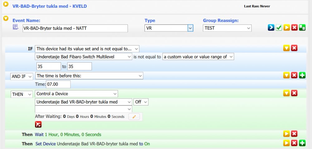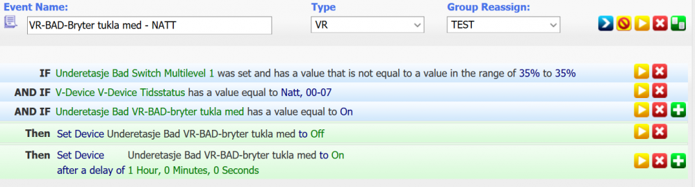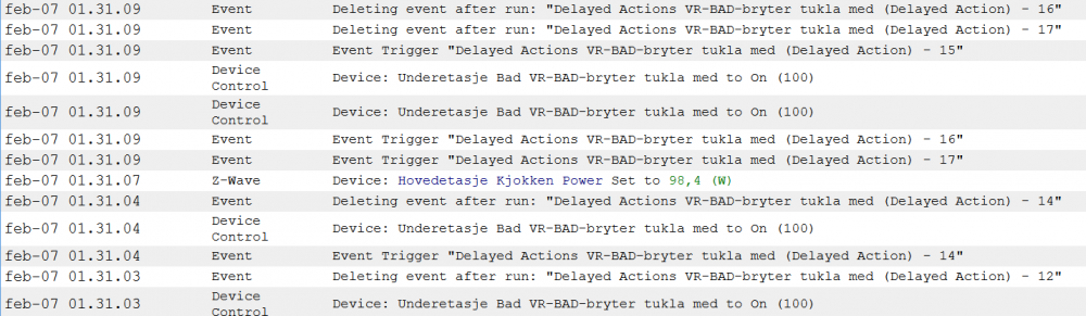 Lyset skrudde seg av slik det skulle siden ingen er på badet. Men dette utløste to andre eventer. Fra log. LES NEDNFRA OG OPP.... feb-07 01.17.41 Device Control Device: Underetasje Bad VR-BAD-bryter tukla med to On (100) feb-07 01.17.41 Device Control Device: Underetasje Bad VR-BAD-bryter tukla med to Off (0) feb-07 01.17.41 Event Event Trigger "TEST VR-BAD-Bryter tukla med - LYS AV" feb-07 01.17.41 Event Event Trigger "TEST VR-BAD-Bryter tukla med - NATT" feb-07 01.17.41 Device Control Device: Underetasje Bad VR-BAD-bryter tukla med to On (100) feb-07 01.17.41 Event Event Trigger "TEST VR-BAD-Bryter tukla med - LYS AV" feb-07 01.17.41 Event Deleting event after run: "Delayed Actions Switch Multilevel 1 (Delayed Action)" feb-07 01.17.41 Device Control Device: Underetasje Bad Switch Multilevel 1 to Off (0) feb-07 01.17.41 Event Event Trigger "Delayed Actions Switch Multilevel 1 (Delayed Action)"