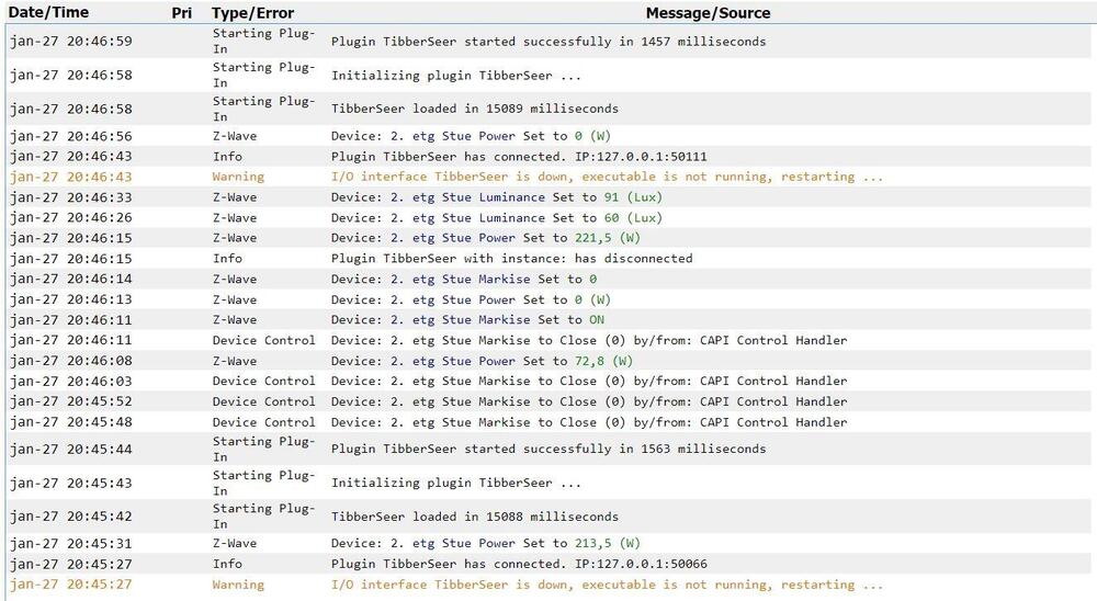 I kveld skjedde det jeg har tenkt på et par ganger, men ikke direkte fryktet - at den store markisen mot vest plutselig skulle finne på å rulle seg ut av seg selv midt i en vinterstorm. Det var heldigvis ikke storm ute, men med 8 sekundmeter vind, og 17 sekundmeter i kastene, så svaiet den godt før jeg fikk kjørt den inn igjen. HELDIGVIS var jeg hjemme, tør ikke tenke på synet som hadde møtt meg i morgen tidlig hvis jeg ikke hadde vært her da dette skjedde! Markisen er koblet til en Fibaro Roller shutter 2 som styres av HS3. Jeg styrer den vanligvis vha HomeSeer appen, men har også lagt inn talestyring via Alexa. Ingen brytere (som små barnehender tilfeldigvis kunne ha kommet borti) eller events som er satt opp, og Alexa-loggen er tom. Så da er jo spørsmålet, hvordan i helsike kunne dette skje? Loggen avslører muligens synderen: Device: 2. etg Stue Markise to Close (0) by/from: CAPI Control Handler Noen som vet hva dette er? Dette skjer 4 sekunder etter at TibberSeer har restartet, men veldig usikker på om det er noen sammenheng her: Plugin TibberSeer started successfully in 1563 milliseconds. Legger ved et utdrag av loggen dersom noen klarer å bli klok på den. Skulle ønske jeg var litt mer paranoid ved monteringen av dette, da hadde det nemlig blitt en fysisk kill-switch slik at jeg kunne tatt strømmen på markisen sånn litt utpå høsten. Er det forresten noen mulighet for å disable av/på (inn/ut) på Fibaroen inntil jeg får på plass en slik bryter? Kjenner at jeg kommer til å sove med minst 2 ører på stilk i natt og lytte etter en svak motordur i det fjerne... EDIT: For ordens skyld: Devicen til markisen står til "On" i HS når den er rullet helt inn.