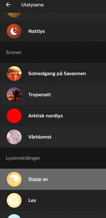 2. Phillips hue Når utelys slås på ved solnedgang har jeg kun 11 fastsatte valg for hvordan de skal lyse . (Lys scene) Kunne tenkt meg egendefinert. Mulig?