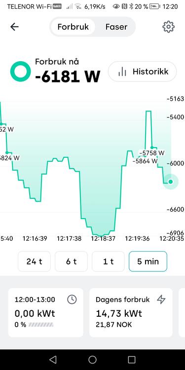 Mitt hjemme anlegg produserer nå kl12:25 9.057kW Volt241,5 241,9 241,3 hittil i dag 28,6kWh Så her går det "så d suser". Problemet er på hytta, der er nett trafo stilt høyt, ca 245v, samtidig som forbruk i omådet er lavt. Håper ikke inverter tar skade av å koble seg inn/ut slik.