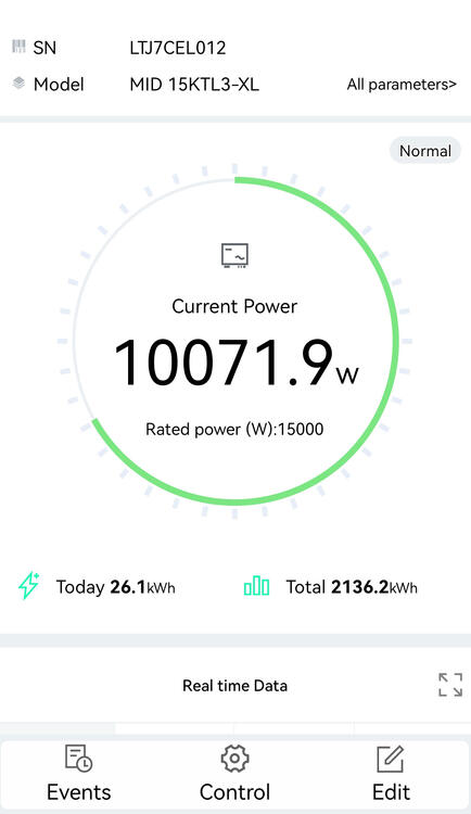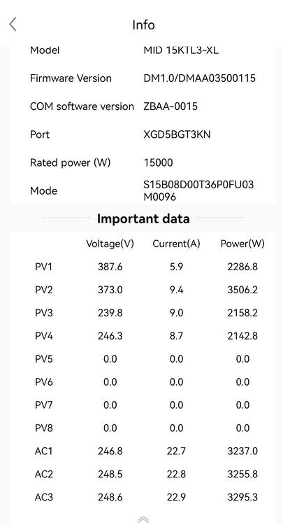 Innstillingene ser greie ut. Kunne kanskje endre "High grid voltage limit" til 253,4, men det vil neppe bety noe. I app finner du spenningen i Current Power. Opp til høyre, velg "All parameters". Viser Info. Nede til venstre, under (Important data) vises AC1, 2 og 3 (Hvis du har 3-fas. Spenningen vises i kolonne under Voltage og skal stort sett ligge mellom 240-250 når anlegget produserer. Hvis spenninegn går over 253 vil inverter stoppe, og nettet kan ikke ta imot.