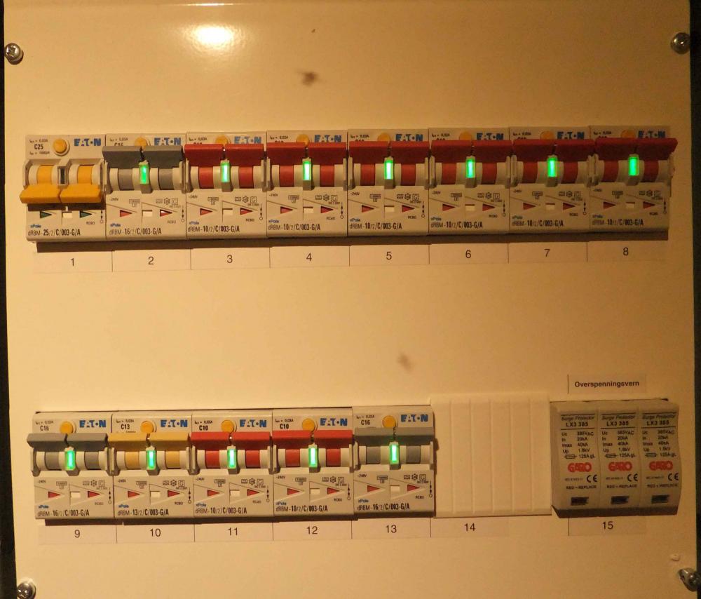 Fikk montert ny innmat i sikringsskapet på hytta. Sikringene er av typen "Digital jordfeilautomat" fra Eaton: http://www.eaton.no/EatonNO/ProdukterLosninger/Elektriske/ProdukterTjenester/Vern/Jordfeilautomater/xDigitaldRBM/index.htm Det ble i tillegg montert overspenningsvern og nytt inntak, k-vern. Dagen etter kom det også en Kamstrup måler inn. Led-dioden midt på sikringen er grønn når alt er ok, orange om jordfeil er "på gang" og rødt ved feil, og da kobler den ut. Energimålerene fra Schneider kan kanskje være en god investering på visse kurser. Men at sikringsskapet er så smart , nja, kanskje litt bedre enn skrusikringer. Sikringene kjøpes billigere her: https://megaflis.no/eaton-jordfeilautomat-digital-10-2-c-003-g-a.html