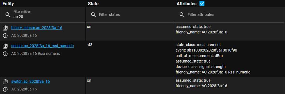 6. Hei! Jeg prøver å sette opp en smarthusløsning basert på HomeAssistsnt, RPI4 og ZWave, men har noen enheter fra Somfy og Nexa som jeg gjerne skulle 'snakke' med. Somfyen går nå bra, men jeg sliter med en Nexa remote. Når jeg bruker RFXmngr så får jeg disse responsene fra remoten: Knapp, ett klikk: ------------------------------------------------ 06.05.2022 09:11:48:853= 0B11000002028F3A10010F90 Packettype = Lighting2 subtype = AC Sequence nbr = 0 ID = 2028F3A decimal:33722170 Unit = 16 Command = On Signal level = 9 -48dBm ------------------------------------------------ Knapp, 2 klikk: ------------------------------------------------ 06.05.2022 09:12:34:152= 0B11000302028F3A10000090 Packettype = Lighting2 subtype = AC Sequence nbr = 3 ID = 2028F3A decimal:33722170 Unit = 16 Command = Off Signal level = 9 -48dBm ------------------------------------------------ Knapp holde: ------------------------------------------------ 06.05.2022 09:13:00:828= 0B11000602028F3A10010F90 Packettype = Lighting2 subtype = AC Sequence nbr = 6 ID = 2028F3A decimal:33722170 Unit = 16 Command = On Signal level = 9 -48dBm ------------------------------------------------ 06.05.2022 09:13:03:672= 0B11000702028F3A10010F90 Packettype = Lighting2 subtype = AC Sequence nbr = 7 ID = 2028F3A decimal:33722170 Unit = 16 Command = On Signal level = 9 -48dBm ------------------------------------------------ Når jeg gjør tilsvarende gjennom HA så får jeg kun generert dette, uansett hva jeg klikker: Jeg får heller ingen endringer på state/atributtverdeier så jeg klarer derfor ikke å plukke opp noen respons gjennom automasjoner!? Så hvis det er noen her på forumet som kan hjelpe meg så ville jeg satt stor pris på det! Mvh, Janski