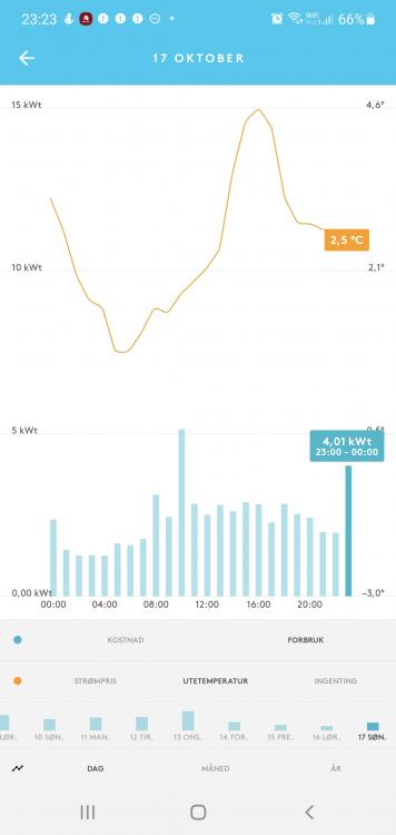 Hei! Eg styrer etter kontinuerlig gjennomsnittsberegning målt forbruk frå tibber Pulse. Styrer 7gulv, 1ovn og varmtvannsberederen. Normalt har eg 7-8kWh forbruk max i mnd, peak kan vere 10-12kWh. (EDIT: MED effektstyring har eg klart å holde meg på ca 4kWh max høgaste time i mnd. Dvs innsparing på ca 150kr i mnd mot 8kWh som er vanlig verdi uregulert. ) Dette ved hjelp av EasyTrigger og Device History plugins. Og masse regler. Det fungerer heilt OK, men drømmen er Stigvi sin PID-regulator konvertert til HomeSeer. Det mest irriterende er tidvis utfall av data frå tibber API-et, slik eg kjører uten måling i etpar timar her og der, dette gjev ofte overskridelser. På søndag hadde eg 2 lengre utfall som resulterte i ny "rekord" i forbruk denne mnd. (I rødt) Effekttariffen min blir målt på den eine(1) timen med høgst forbruk i mnd. Eg har kjøpt inn et zigbee HAN-interface, men har ikkje fått tid å bytte ut Pulse enda. Har også splitter, men usikker på om den fungerer riktig. -