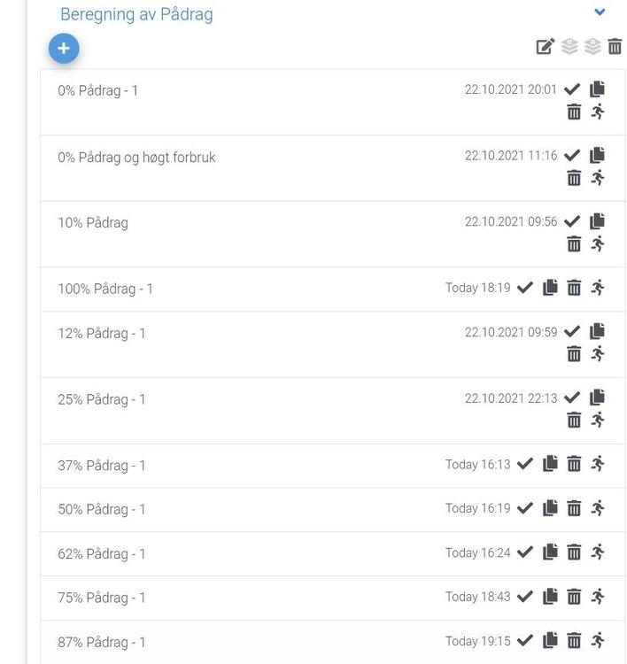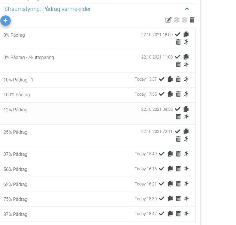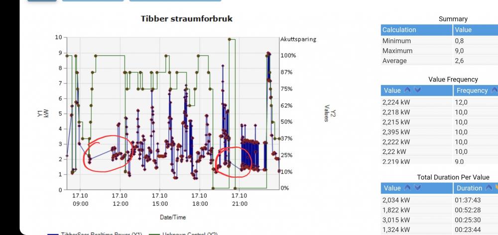 Hei. Light oppdatering etter montering av Aeotec Heavy duty smart switch på varmtvannsberederen: Dette har absolutt god effekt som virkemiddel for å regulere gjennomsnittsforbruk. Målet er å aldri overstige 5kW pr. time, det vil gi ca 150kr i innsparing pr mnd på effektleddet. Eg har 10 ulike reguleringstrinn. Første forsøk på å sette inn varmtvannsberederen var når gjennomsnittsberegning av forbruket nådde 4,5KWt. Dette gav ikkje tilstrekkelig effekt, slik at når vaskemaskin, tørketrommel og oppvaskmaskin kjørte samtidig, blei det overskridelser. Som ekstra utfordring har barna eit plaskebasseng på taket med uregulert 3KWt varmeelement som gir mellom 30 og 35grader vanntemperatur, dette går en times tid i slengen, med etpar timer pause, ser det ut som. Screenshot 2, tilsvarende situasjon. Viser nåværende prioritering av varmtvannsberederen, som slår ut ved mindre enn 75% pådrag. (100% betyr full tilgang på effekt, 0% betyr fullt sparemodus). Ved 62%(snittforbruk over 3KWt)forsvinn 2kW effekt når berederen blir slått av, og dette gir tidlegare effekt og lavare snittforbruk. Det ser ut til vi får nok varmtvatn sjølv med lavere prioritering. Mvh