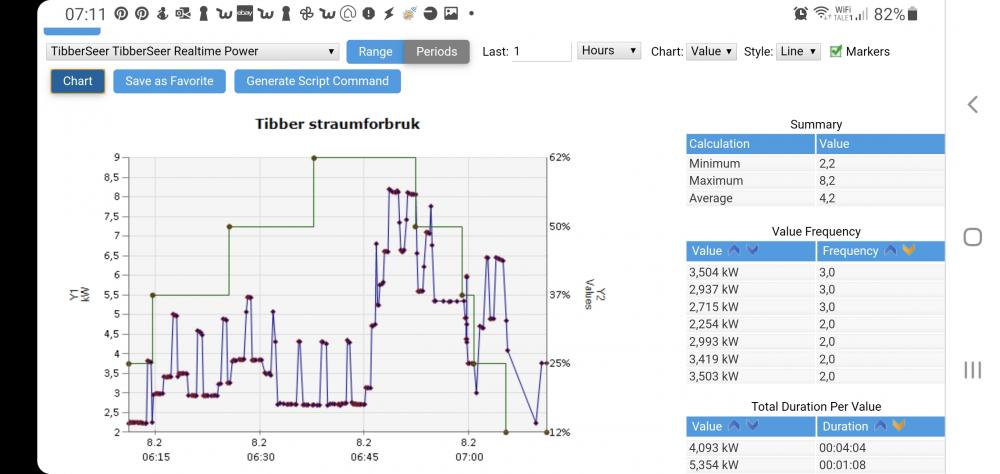 Hei! Det har gått litt tid, men har fått gjort meg litt erfaringer. Eg har laga til prioritering på kvar enkelt varmekilde, der maks strømforbruk i snitt er 4,5kWt sist time. Dette fungerte bedre enn eg håpte, men då treng eg ikkje estimere, då kjører vi ut fra kjente tall. *1: Eg oppretta et device som held verdien for pådrag, om huset skal varme, eller ikkje varme. Bruker % for illustrasjon. 0% skal gi lite oppvarming, 100% skal gi full oppvarming. *2: Her oppretta eg eit regelsett som tar hensyn til gjennomsnittsberegning fra Tibber Pulse sist time, ved hjelp av Device History plugin. I tillegg har eg lagt til hensyn til strømpris og temperatur i stue i forhold til settpunkt på varmepumpe(om det er sol eller vedfyring blir temperatur høgare.) Resultatet her blir skrevet til devicet som lagrer % pådrag, (*1). *3: Så laga eg regler som blir valgt ut fra regelsettet over, der eg har lagt til alle varmekilder med 8 forskjellige temperaturinnstillinger, der 1,2,3-8 varmekilder varmer. *4: For å holde oversikt over kva pådrag som er aktivt, har eg lagt inn devicet som lagrer pådrag fra regelsettet på lagring i Device History. Eg skal prøve å ta meg litt tid og legge inn regelsetta, for å vise bedre det som ligg bak og styrer. Det viktigste her er at eg får kontroll på forbruket mitt, og eg sikter på max 5kWt som høgste time i mnd. Nederste bildet viser når huset går ut av time med høg strømpris.