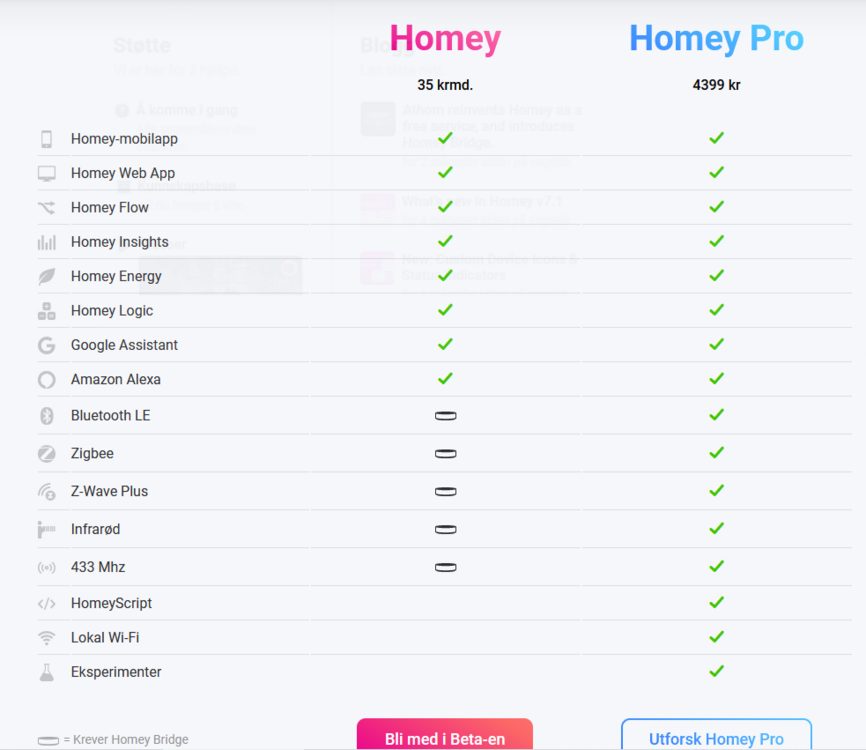 ja det er litt rart, samtidig er det tydelig at man ikke bør kjøpe det før man har fått invitasjon i betaen. Uansett, hva tenker dere generelt om denne nye modellen? Kostmessig er det lønnsomt til tross for en månedlig betaling på 35kr. Homey pro: 3800kr og ferdig med det. Homey Bridge: 800kr + 35kr per måned, altså 420kr per år. Det betyr at etter 7 år (si 6 med med sannsynlig prisøkning) har du betalt samme summen som Homey Pro. Men det er sannsynlig at om 5-6 år må man likevel opppgradere Homey pro, siden industrien vil ikke la oss være i fred og vil nok tvinge oss til å bruke nye protokoller. Så hva er egentlig grunnen til å kjøpe Pro nå? Det viktigste er at Pro fungerer uten internett, mens Bridge ikke? Og at Pro vil være raskere? (selv om Athom sier at deres cloud vil være lynrask...)