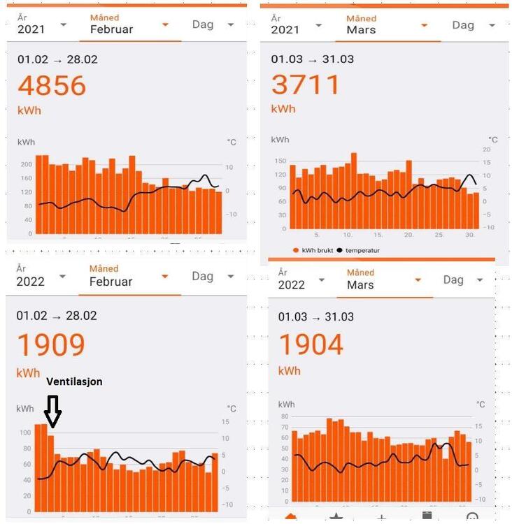 Inspirert av de høye strømprisene satte jeg i gang et automasjons prosjekt rett før jul. Etter å ha lest meg opp på dette forumet valgte jeg å gå for Homeseer. Det virket som et vel innarbeidet og solid system. Og så var det ganske godt dokumentert, har mange brukere og mange tilleggsfunksjoner i form av plugins. Jeg har foreløpig kun valgt å automatisere strømforbruk. Og det virker! Systemet ble satt i gang i Desember og har blitt bygget ut litt etter litt. Som sammenligningen viser har jeg ca halvert forbruket i forhold til i 2021. Februar 2021 var mye kaldere enn 2022, men Mars hadde ca samme temperatur. Den virkelig store besparelsen kom når jeg begynte å styre ventilasjonsanlegget 3 Februar. Se figur (Fjordkraft) Huset er på ca 160kvm på en flate pluss en liten annen etasje. Så stor flate gir mye varmetap så forbruket har vært høyt. Huset har varmekabler i alle gulv bortsett fra soverom som har Adax varmeovner. I 2018 fikk jeg en varmepumpe installert, og så installert en til på høsten 2021, så det har også bidratt til senking av forbruk. Jeg har satset på en enkel strategi. I periodene strømmen vanligvis er dyr reduserer jeg forbruket. Dvs sånn ca mellom 06:00 og 11:00, og mellom 16:00 og 19:00. - 2 varntvannsberedere slås av. - 2 hjemmekontor setter ned termostat til 15 grader, mot normalt 20. - Bad og gang, slår på nattsenking på varmekabler. - Varmepumper i to stuer- senker til 15 grader. - Ventilasjon, se lenger ned. - Gulvarme i stuer avslått hele tiden. Dette styres delvis med Shelly WiFi relemoduler og mcsShelly plugin i HomeSeer. Jeg valgte WiFi siden dette synes enklere når en allerede har et nettverk som dekker et hus med stor grunnflate. Adax ovnene styres av Guahtdim’s AdaxSeer og varmepumper av MelcloudClimate plugin. Stor takk til ham. Styring av ventilasjon, Flexit VG400 Det ante meg at ventilasjonsanlegget som er 20 år gammelt med en enkel kryssvarmeveksler pumper mye varme ut. Og etter å ha fått styring på den falt forbruket vesentlig. Ventilasjon kjøres på min hastighet en halv time 4 ganger i døgnet, kl 23;00, 03:00, 10:00 og 14:00. I tillegg er det en fuktføler fra Shelly på badet som slår viften på full om luftfuktighet overstiger 70 prosent, og kjører den på lav når fuktigheten er mellom 55 og 70 prosent. Hvis noen har tatt en dusj og viften har kjørt er det en inhibit funksjon som gjør at viften ikke vil starte på nytt på tid neste 4 timer. Graf viser luftfukt- blå og vifte over 1,5 døgn. For å sjekke at luftkvaliteten ikke blir får dårlig har jeg en Netatmo stasjon som måler CO2 innhold. Det ligger mellom 600-1000 som er helt greit. Det er med to personer i huset. Se detaljer om Flexitstyring her: Flexit VG400 Videre arbeid Jeg har begynt å lage en plugin som leser day ahead priser fra Entsoe for å få litt bedre kontroll. Den fungerer som en konsollapplikasjon, men det gjenstår å få den til å virke som plugin. Jeg tenker også til å legge inn styring av maks forbruk i samme app. Har en AMS-leser som ikke er koblet opp enda. Egentlig er jeg ikke sikker på om det er så mye vits i å bruke day ahead priser siden toppene alltid er på samme sted. Det er mer det at det er en flat pris som gjør det unødvendig å stenge ned. Mulig jeg bruker Netatmo/ CO2 til å styre ventilasjon i tillegg. -