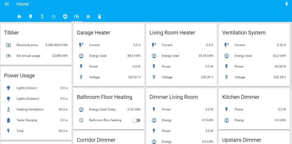 Får oppdatere denne litt. Fått gjort litt siden sist. Ryddet litt opp i home assistant gui på grupper osv og lagt til flere smartenheter og automasjoner. Ting som er gjort siden sist. - flere sensorer og dimmere - Dørlås - heatit varmekabel termostat (Satt opp med måling av forbruk selv om det er v1) - Oppgrader alarmsystem med sirene og flere sensorer. - Nest røykvarslere i stue, oppe og garasje som er koblet mot hass. Går brannalarmen blir alle lys skrudd på er det kveld, samt led lys i trapp bytter til maks styrke og grønn for å vise veien ned og ut. - Måling av forbruk på flere ting som bla elbil. - styring av downlights ute på huset og garasje basert på høyde av solnedgang/oppgang - "husmoduser" og automatisk styring av disse, så går i nattmodus osv av selg selv men kan også overstyres ved behov. - Styring av Mitsubishi Varmepumpe (Kaiteki). Her har jeg satt opp en ganske avansert automasjon som styrer om den settes i kjølemodus, varmemodus eller vifte samt vinkel på spjeldene basert på utetemp, temp oppe og nede, temperatur forskjell mellom oppe og nede (eks varmt oppe og en del kaldere nede går bare vifte på og kaster varmluft ned (Pumpa står i trappeoppgang så kan varme/kjøle begge steder) Er det veldig kaldt i kroken i stua går også en ekstra varmeovn på for å hjelpe. Er også satt opp feriemodus, nattmodus, bortemodus samt at den kjører en ekstra boost med varme om morgenen hvis det er kaldt ++ Gått mange timer med knot her ? Det er det jeg kommer på Slik ser det ut nå.