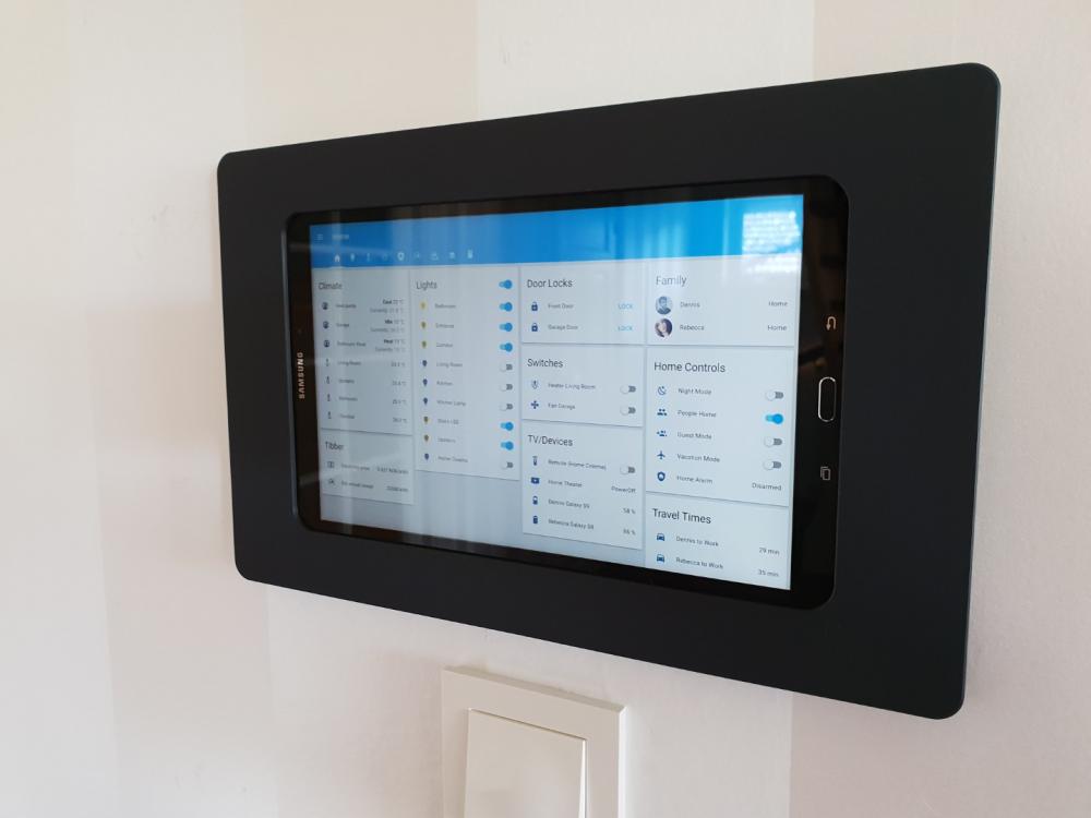 Begynt med Lovelace sånn smått nå Også fått montert opp en tablet på veggen som får strøm fra baksiden. Feste er fra Vidabox. Bruker en Android app som heter WallPanel mot Home Assistant som gjør at skjerm skrur seg på automatisk når man nærmer seg ved bruk av frontkamera.